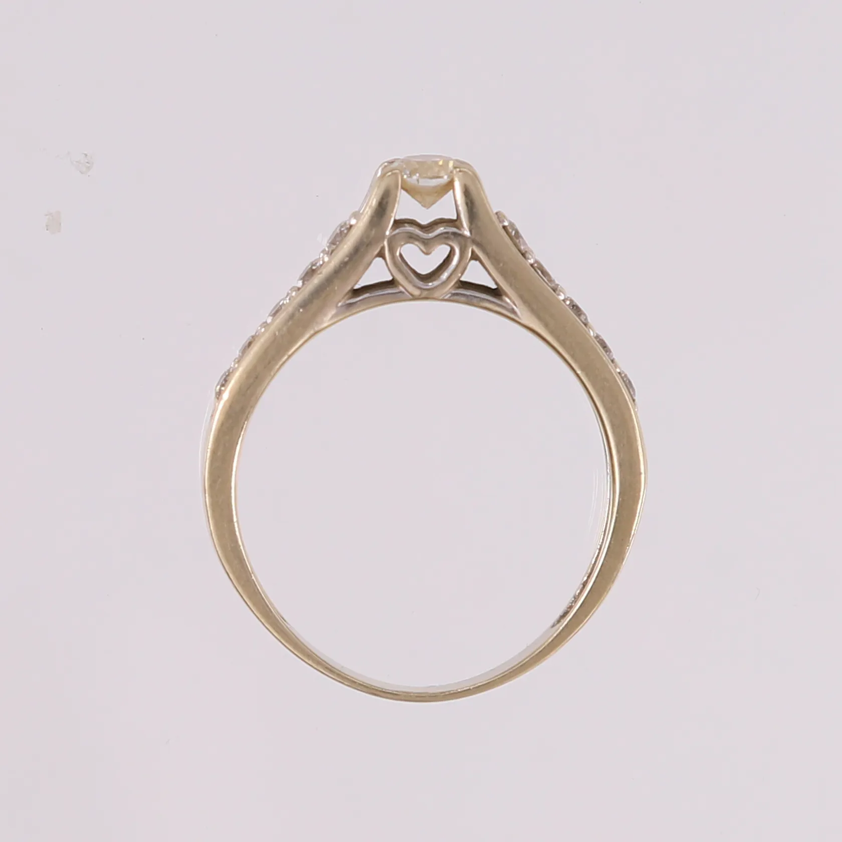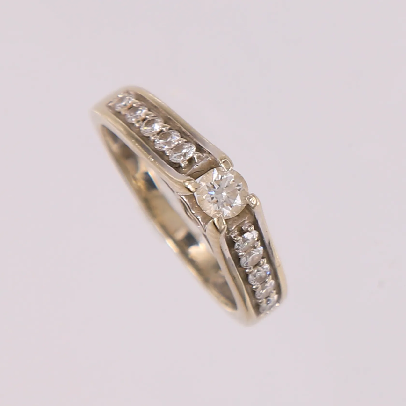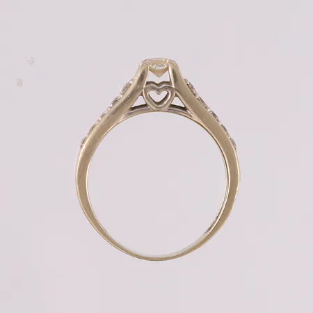 Ring med diamanter (1 x ca. 0,18ct og 10 x ca. 0,02ct), ø16,8mm, bredde 1,9- 4,3mm, hvitt gull, 14K Vekt: 3,2 g Kontakt Lånekontoret for frakt