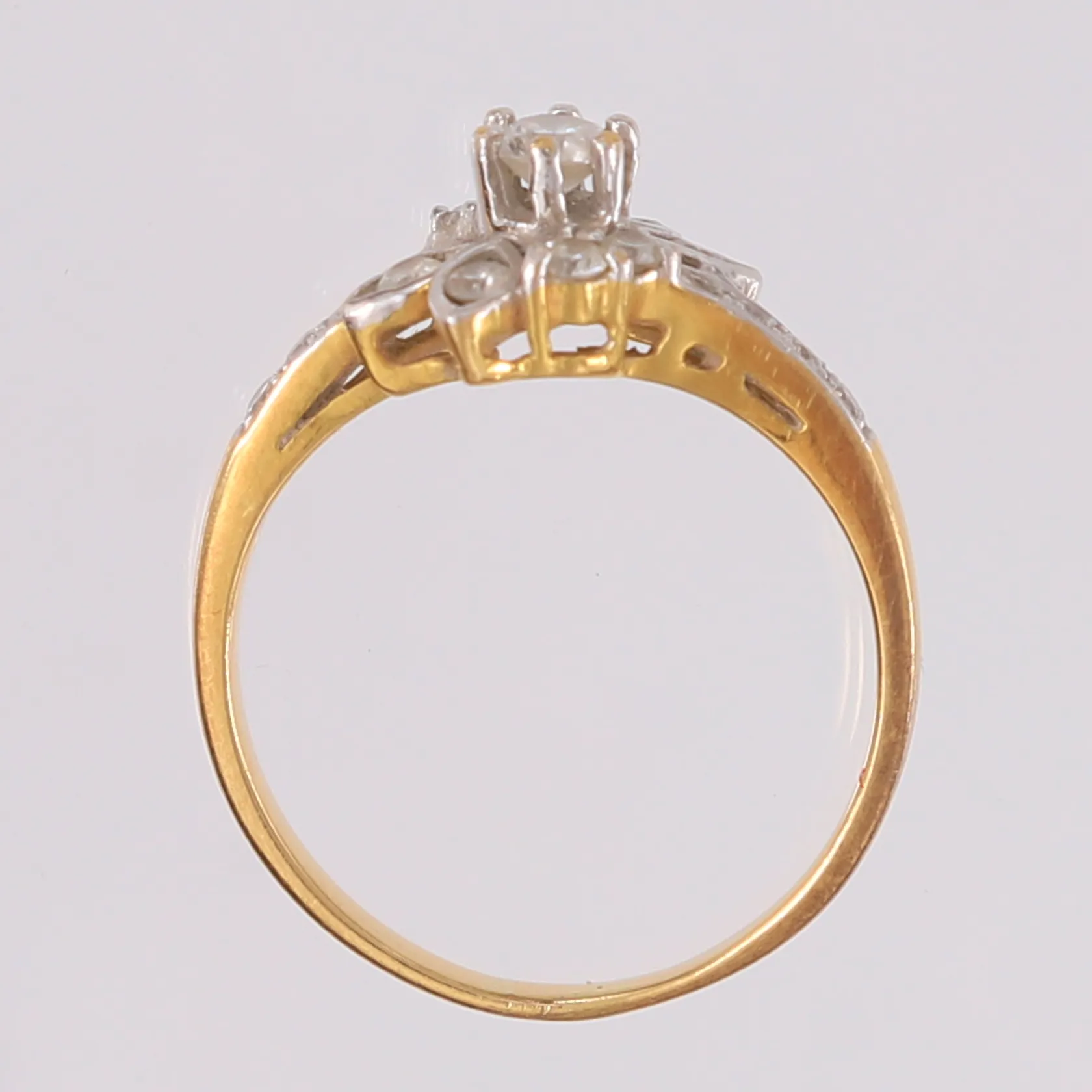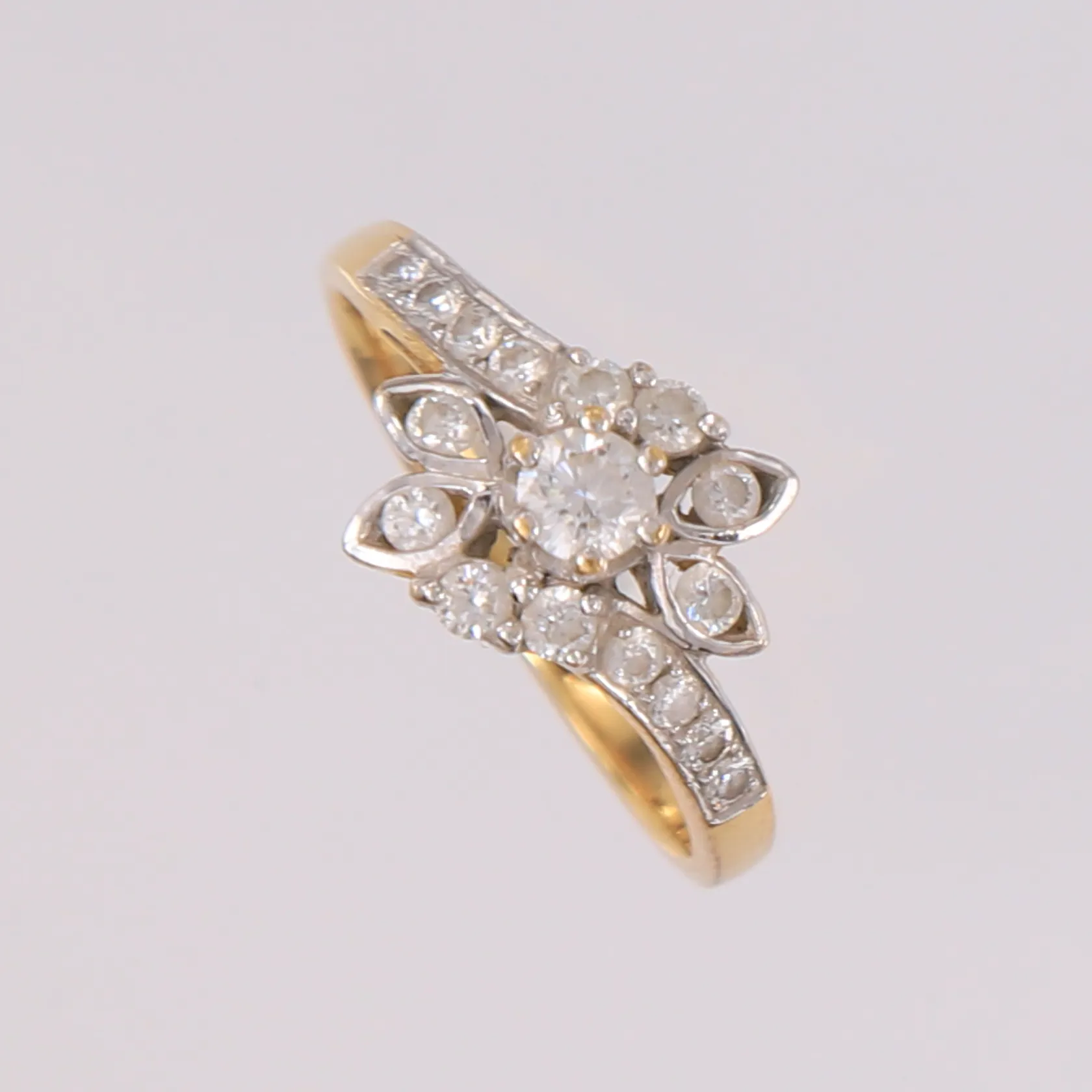 Ring med diamanter (1 x ca. 0,15ct + 8 x ca. 0,03ct + 8 x ca. 0,015ct), ø16,9mm, 1,7- 10,9mm, 18K Vekt: 3 g Kontakt Lånekontoret for frakt