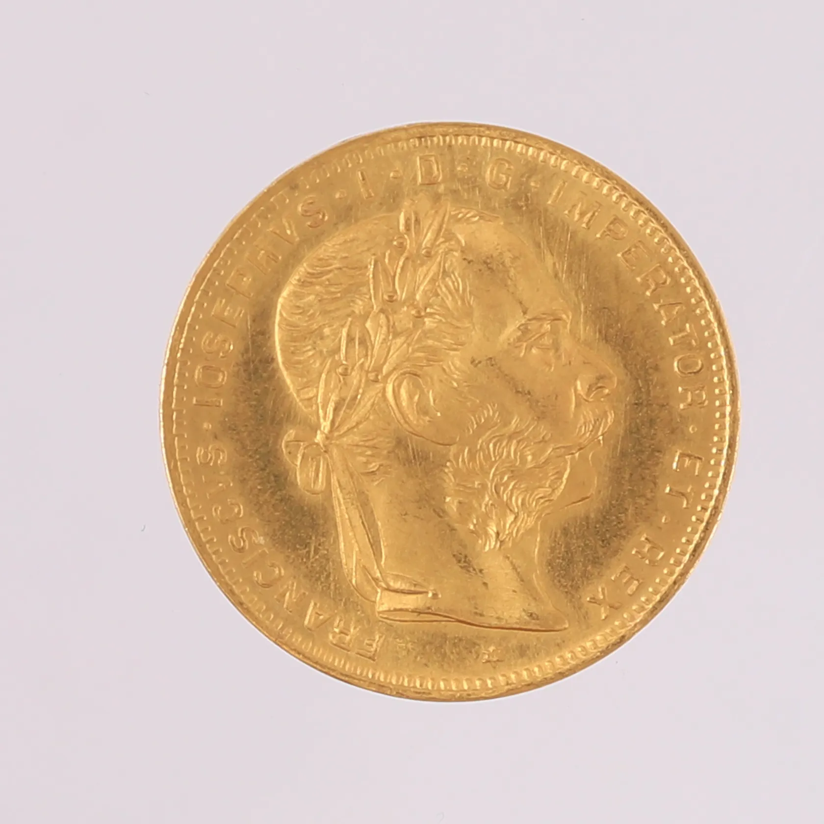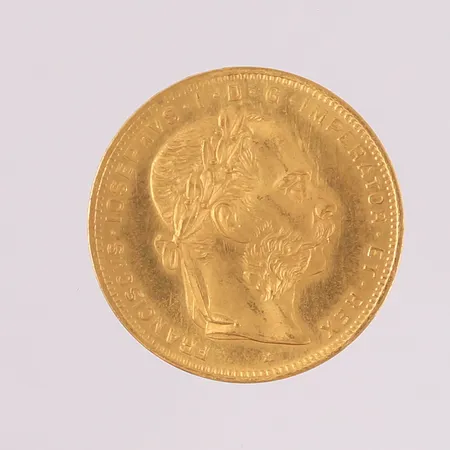Gullmynt, ø21mm, tykkelse 1,25mm, 8 florin, Østerrike-Ungarn Franz Joseph I, år 1892, 22K Vekt: 6,4 g Kontakt Lånekontoret for frakt