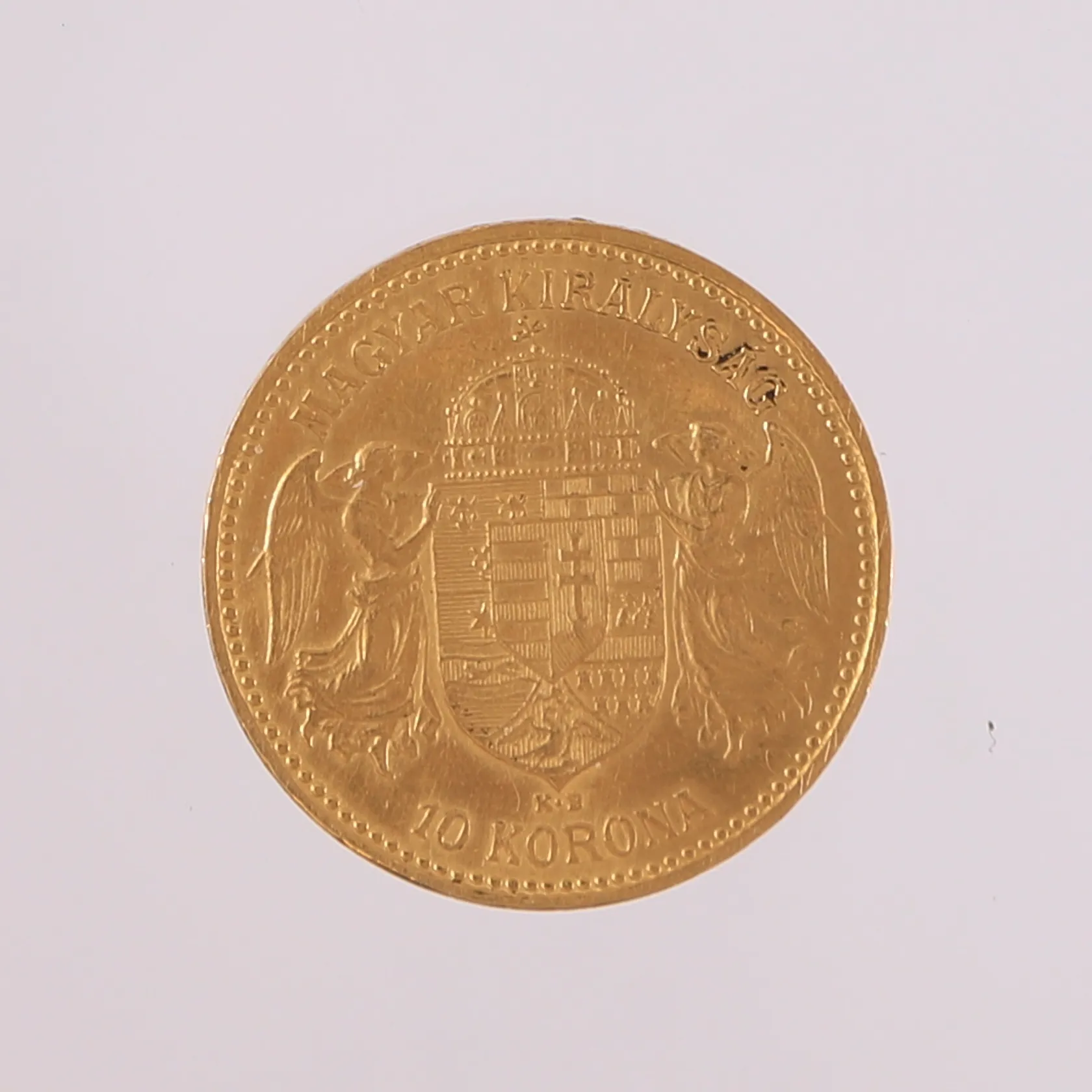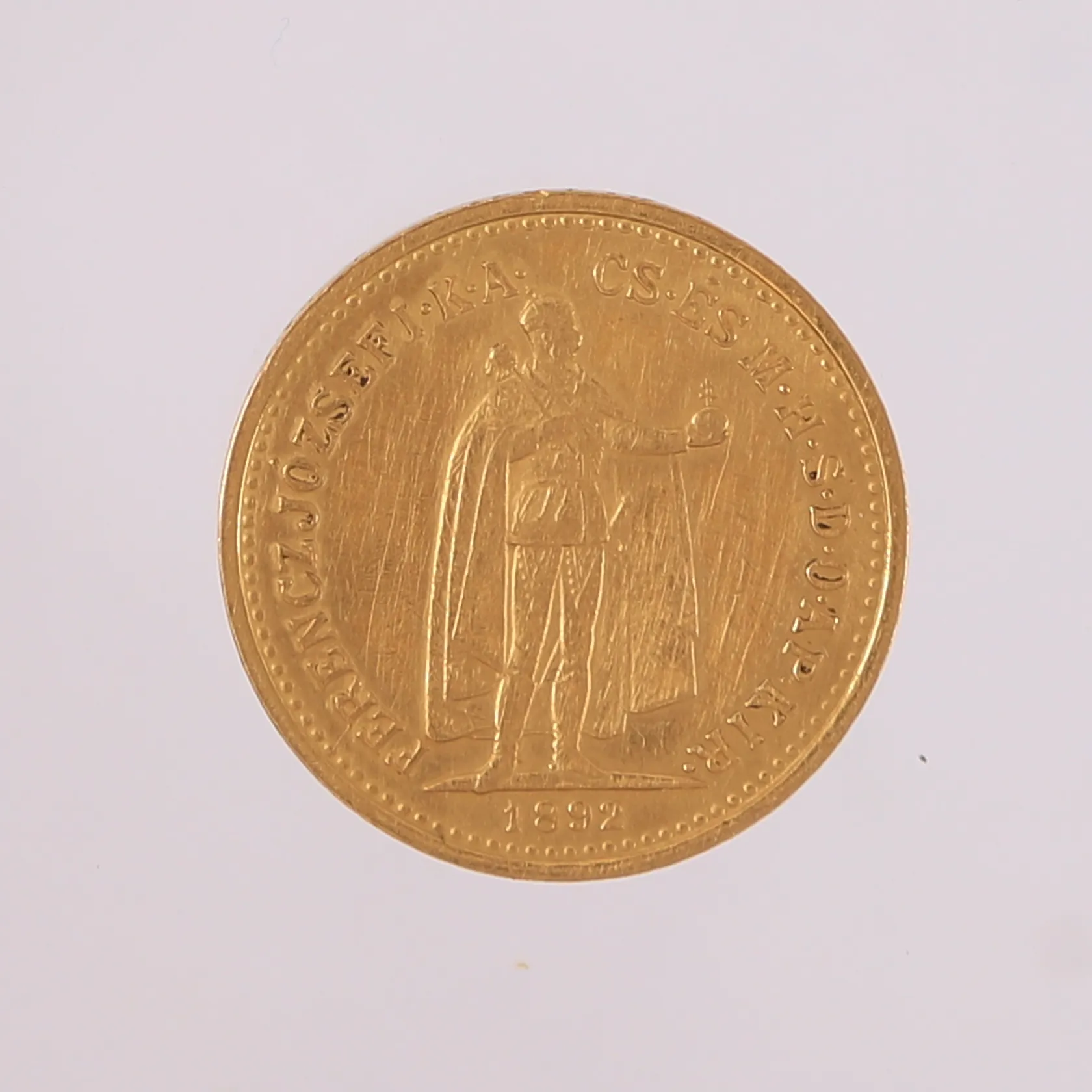 Gullmynt, ø19mm, tykkelse 0,84mm, 10 korona, Østerrike-Ungarn Franz Joseph I, år 1892, 22K Vekt: 3,3 g Kontakt Lånekontoret for frakt