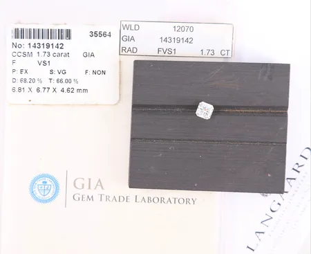 Én stk. diamant/briljant, 1,73ct (TW F / VS1), radiantslipt (Cut cornered square modified brilliant), med GIA-sertifikat og takstbrev fra Langaard Vekt: 0 g Kontakt Lånekontoret for frakt
