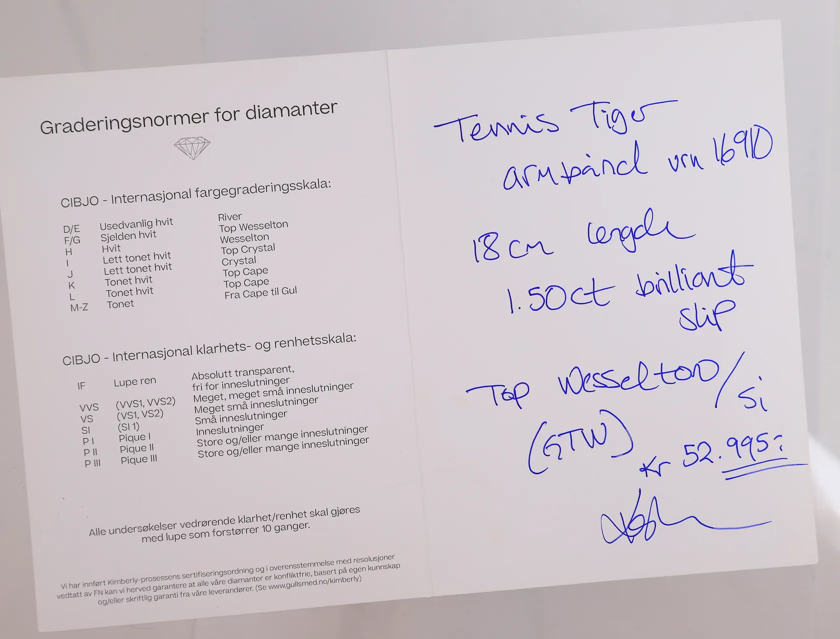 Tennis-armbånd med 58 briljantslipte diamanter (totalt 1,50ct iht. sertifikat, TW / SI), lengde 18cm, bredde 3mm, hvitt gull, 14K, bruttovekt 6,3g, med diamantsertifikat og boks fra Bjørklund Kontakt Lånekontoret for frakt