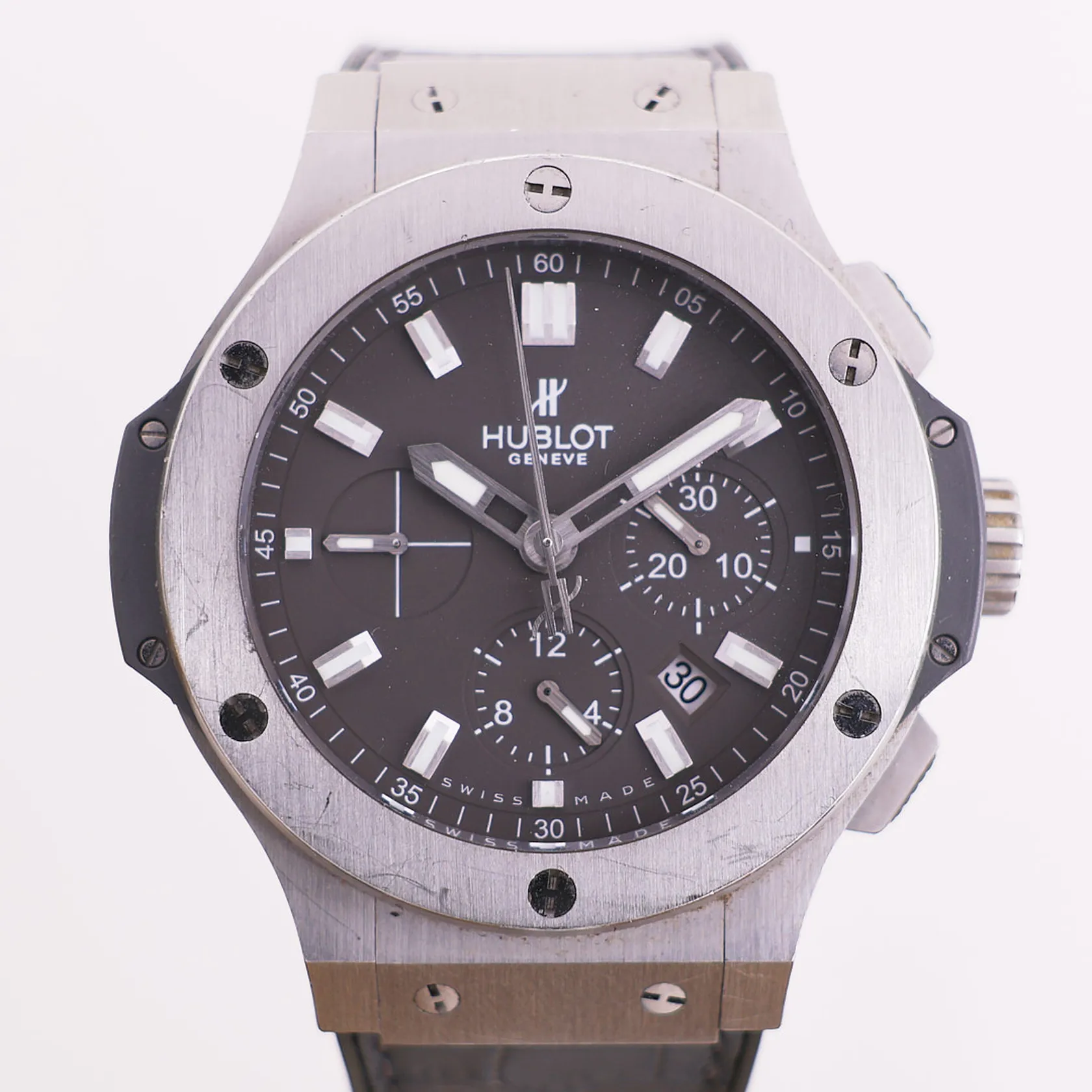 Hublot Big Bang, Ø 44mm, stål, ref 301.ST.5020.GR, snr 889472, caliber 4100, 27 juveler, automat, kronograf, dato, safirglass, sertifikat år 2012 (chip) med USB, pute, boks, yttereske Kontakt Lånekontoret for frakt