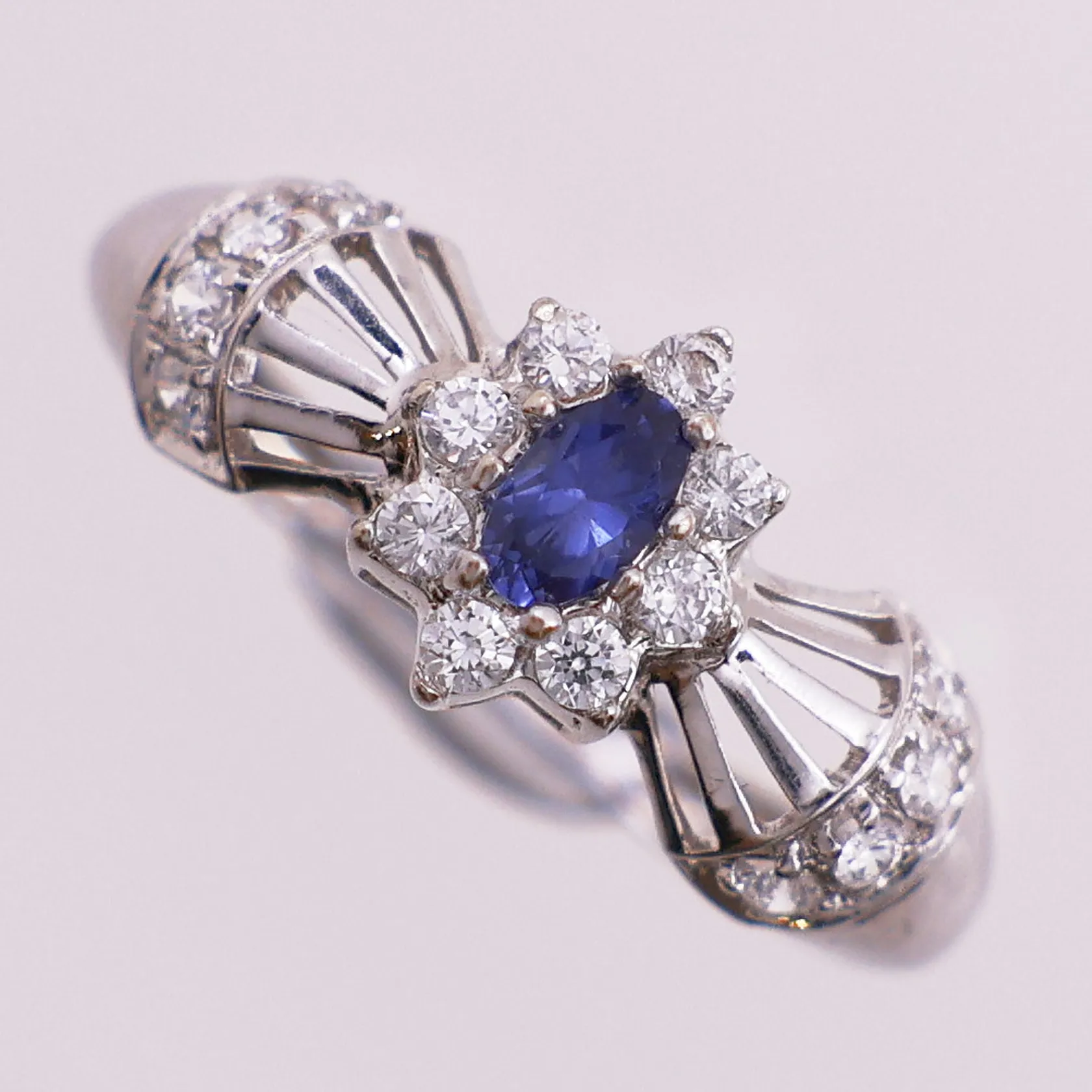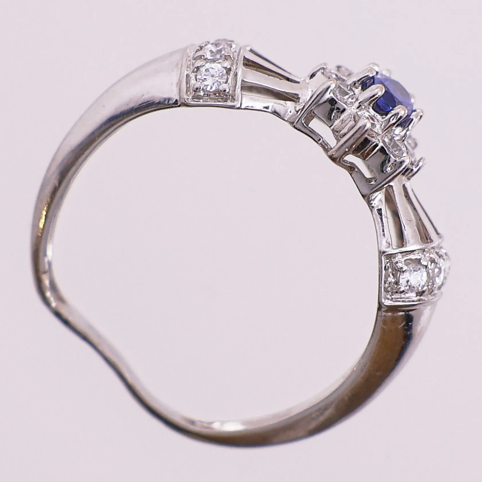 Ring med blå sten og klare stener, Ø 18 mm, bredde 1,9 - 9,5 mm, bulket, 14K Vekt: 2,8 g Kontakt Lånekontoret for frakt