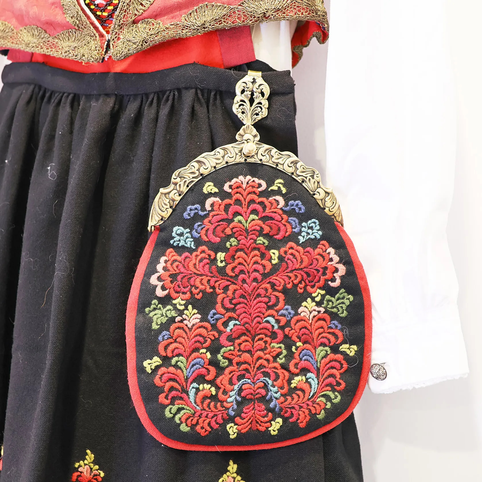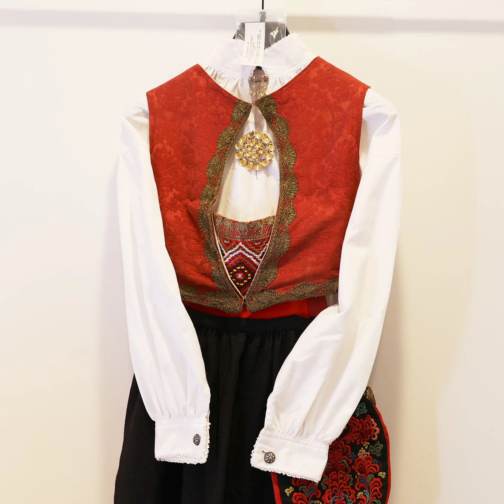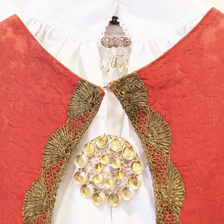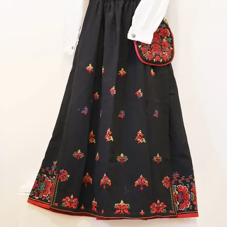 Sigdal Eggedal bunad dame, sjorte, halsølje, brystsølje, 2 par mansjettknapper, veske, forkle, bringeklut, sølv 830S Vekt: 0 g Kontakt Lånekontoret for frakt