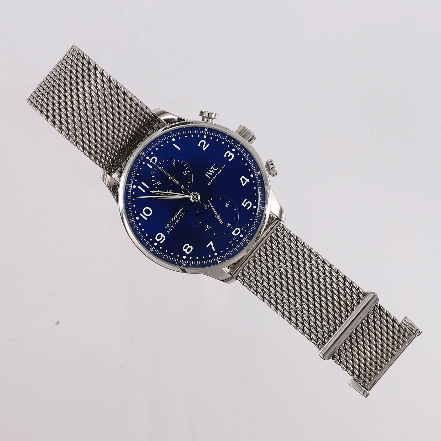 IWC Portuguese Chronograph, edition 150 years, one out of 2000, ref. IW371601, automatisk, blå urskive, Milanaise strap, snr: 6171765, cal. 69355, urverksnr. 4496717, lær-etui og garantikort fra år 2019 Kontakt Lånekontoret for frakt