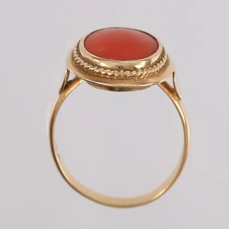 Ring med rød-oransje sten (trolig korall), ø19,5mm, bredde 2,4- 19,3mm, 14K, bruttovekt 4g Vekt: 0 g Kontakt Lånekontoret for frakt
