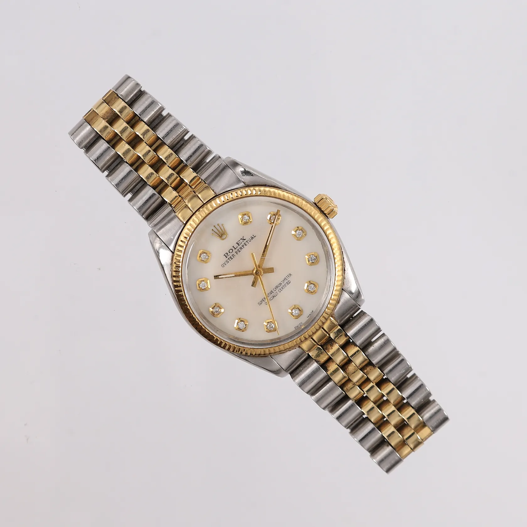 Rolex Oyster Perpetual 34, ref. 1005, snr. 8045198, cal. 1570, ø34mm, stål/gull, med diamanter (totalt 0,11ct G-H / VS2-SI1 iht. takst), automatisk, jubilee-lenke med foldelås, urskive i perlemor, slitasje på urskive og på pleksiglass, med boks, ytterboks og assuransetakst fra år 2009 Kontakt Lånekontoret for frakt