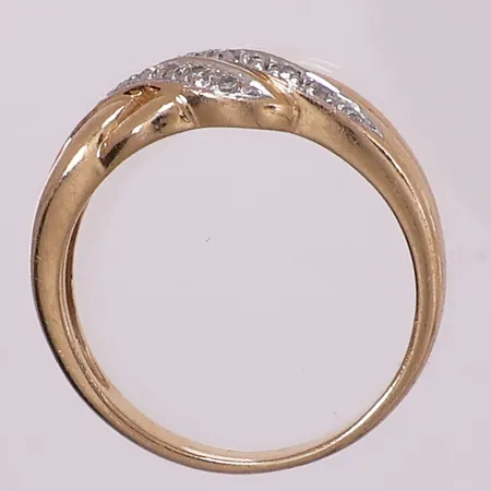 Ring med klare stener, Ø 17, mm, bredde 2,2 - 8,3 mm, 14K Vekt: 3,6 g Kontakt Lånekontoret for frakt