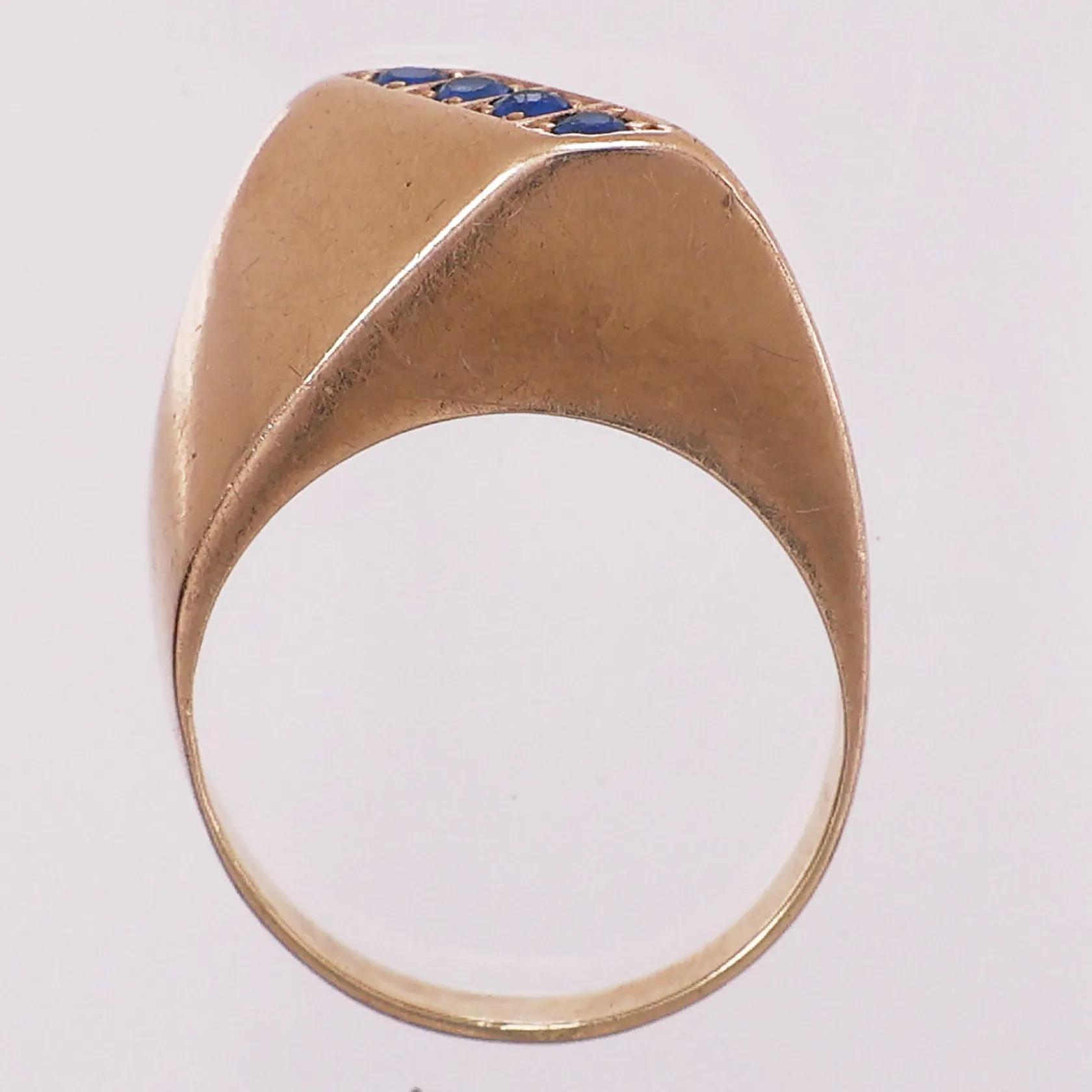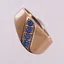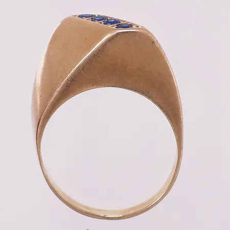 Ring med blå stener, Ø 16,9 mm, bredde 2,8 - 10,8 mm, 14K Vekt: 4,1 g Kontakt Lånekontoret for frakt