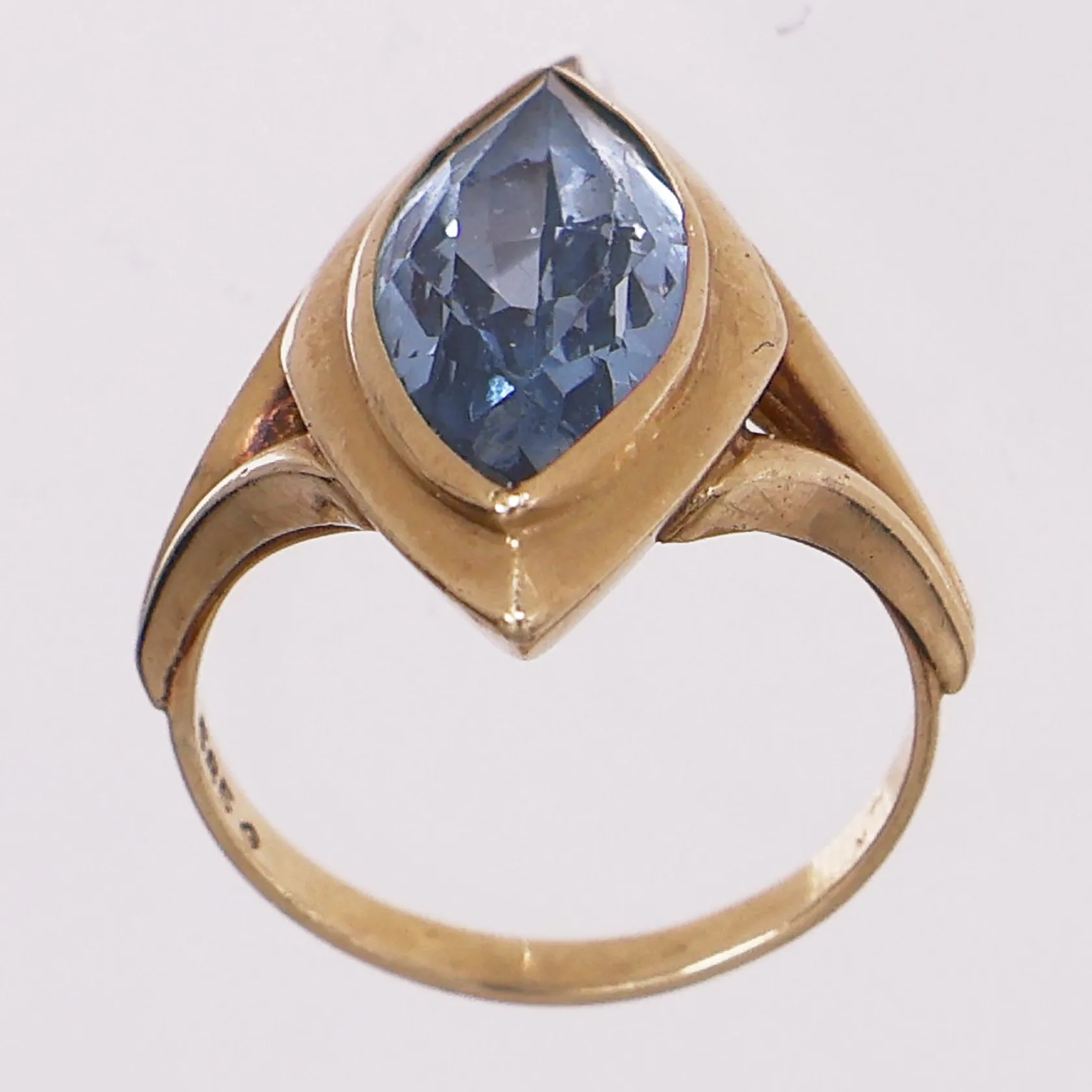 Ring med blå sten, Ø 17,2 mm, bredde 2,2 - 23,3 mm, 14K Vekt: 3,9 g Kontakt Lånekontoret for frakt