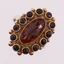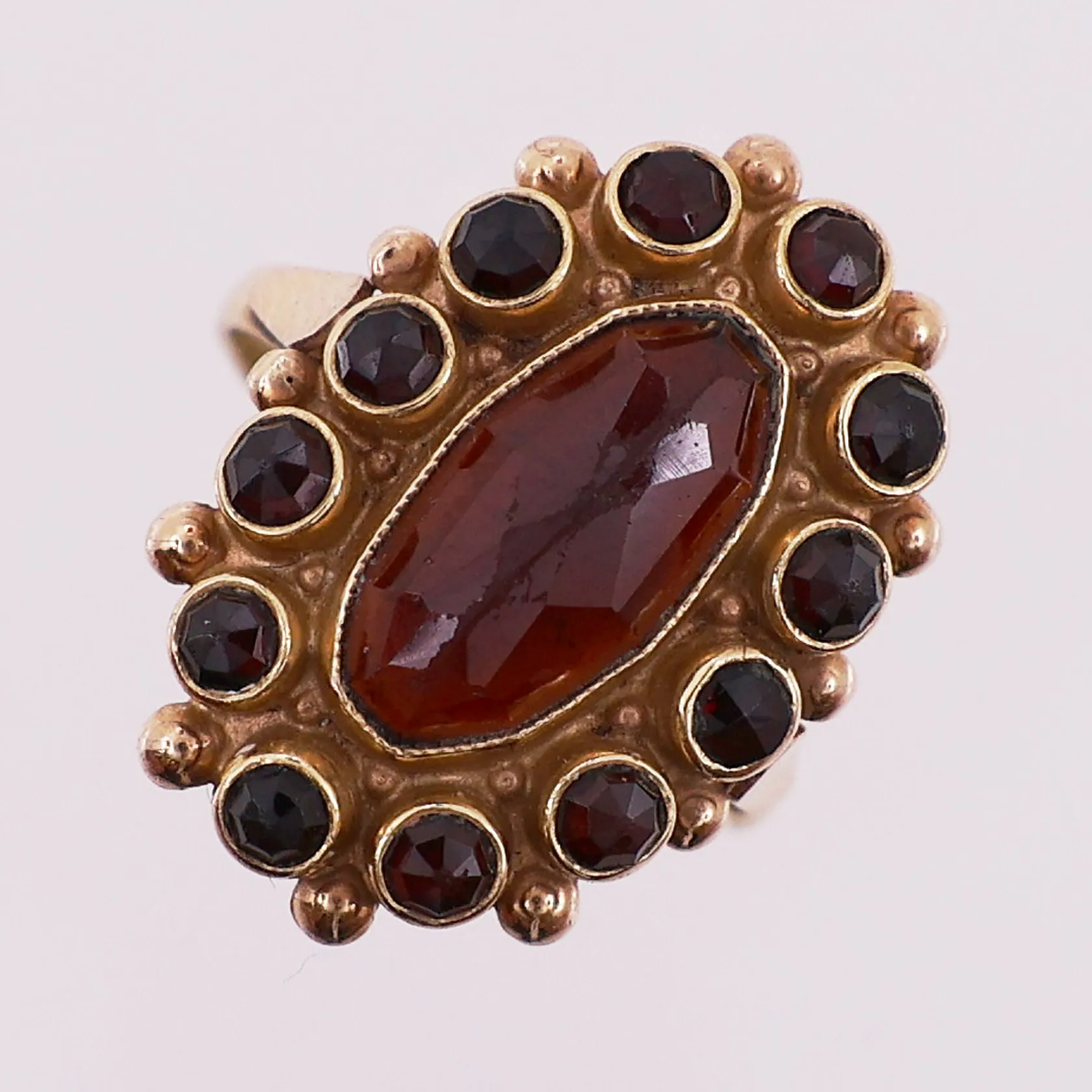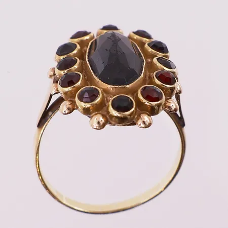 Ring med røde stener, Ø 18,2 mm, bredde 1,9 - 22,8 mm, mangler stempel, 14K Vekt: 5,8 g Kontakt Lånekontoret for frakt