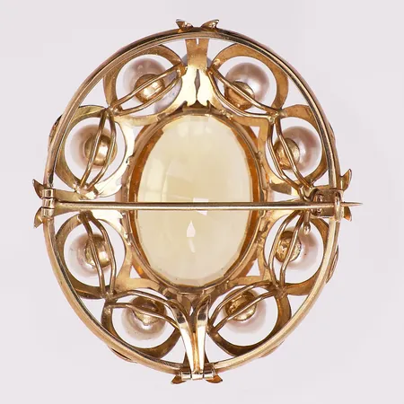 Brosje med perler og gul sten, lengde 5,5 cm, bredde 39 mm, 14K Vekt: 20,8 g Kontakt Lånekontoret for frakt