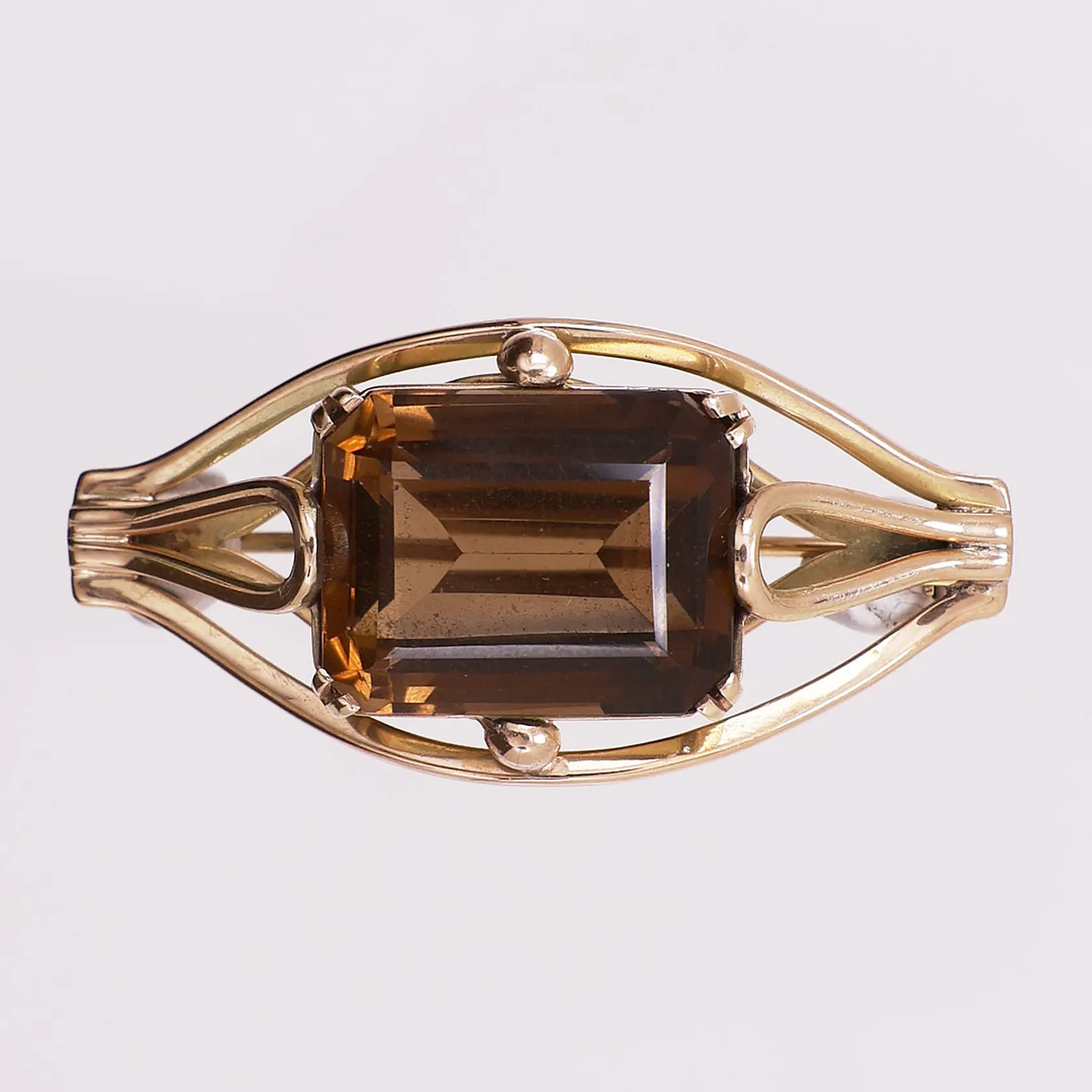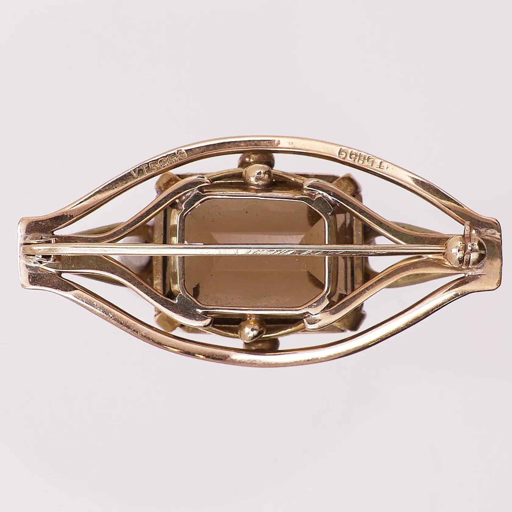 Brosje med brun sten, lengde 45,6 mm, bredde 22,2 mm, 14K Vekt: 15,3 g Kontakt Lånekontoret for frakt