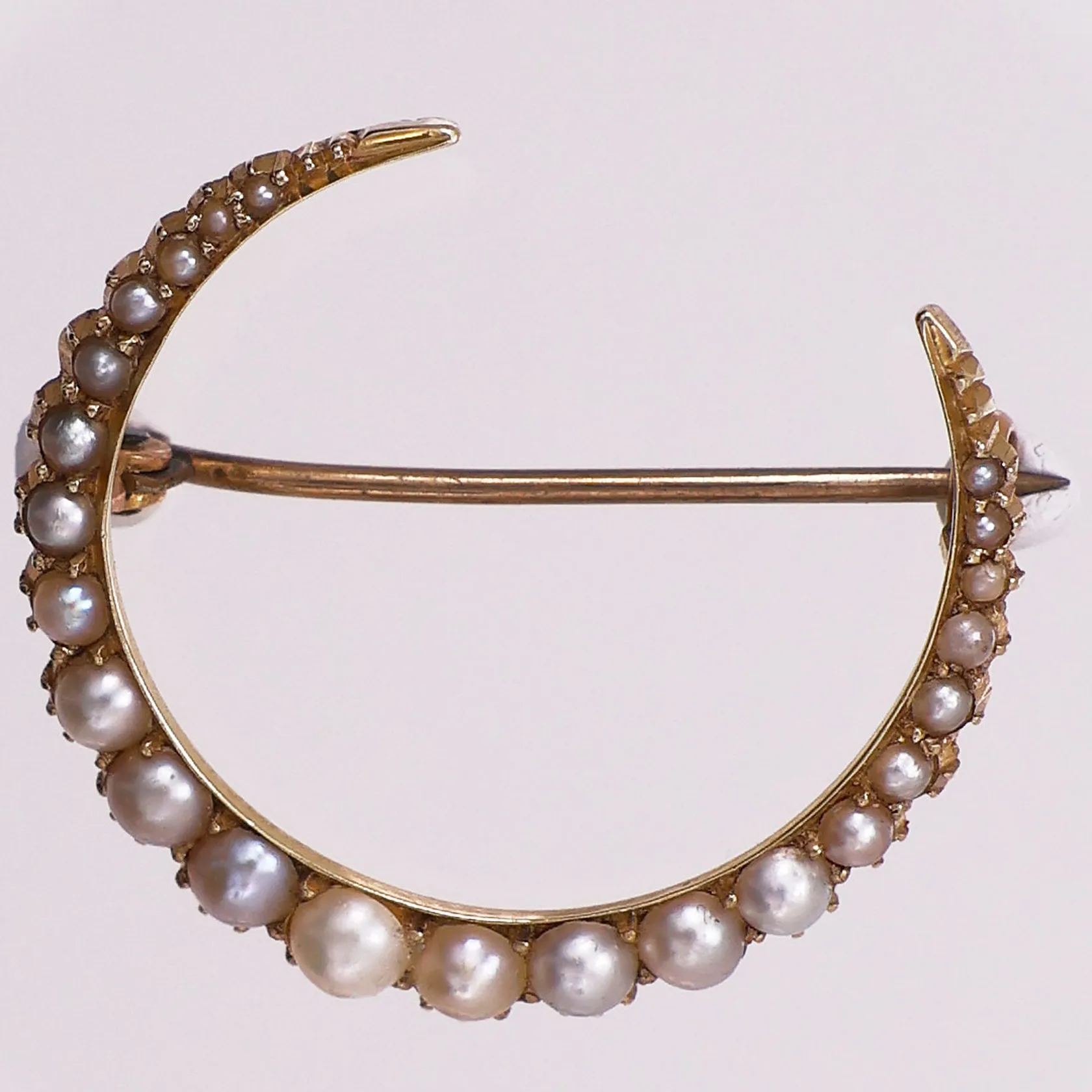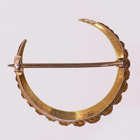 Brosje med perler, Ø 24,7 mm, bredde 5,8 mm, mangler stempel, 14K Vekt: 3,8 g Kontakt Lånekontoret for frakt