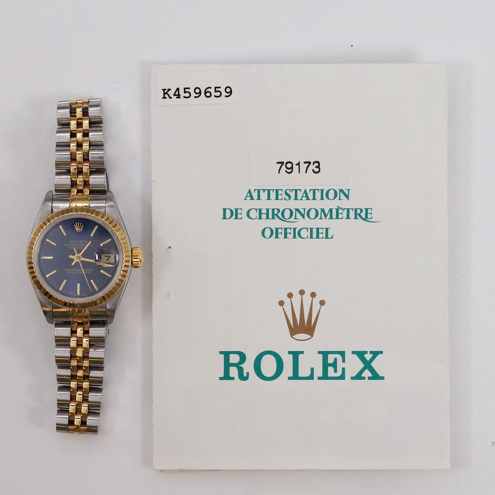 Dameur Rolex Datejust, stål/gull, automatisk, ø25mm, ref. 79173, snr: K459659, blå urskive, safirglass, dato, med boks og garantikort (kjøpt Urmaker Bjerke 06.04.2002) Kontakt Lånekontoret for frakt