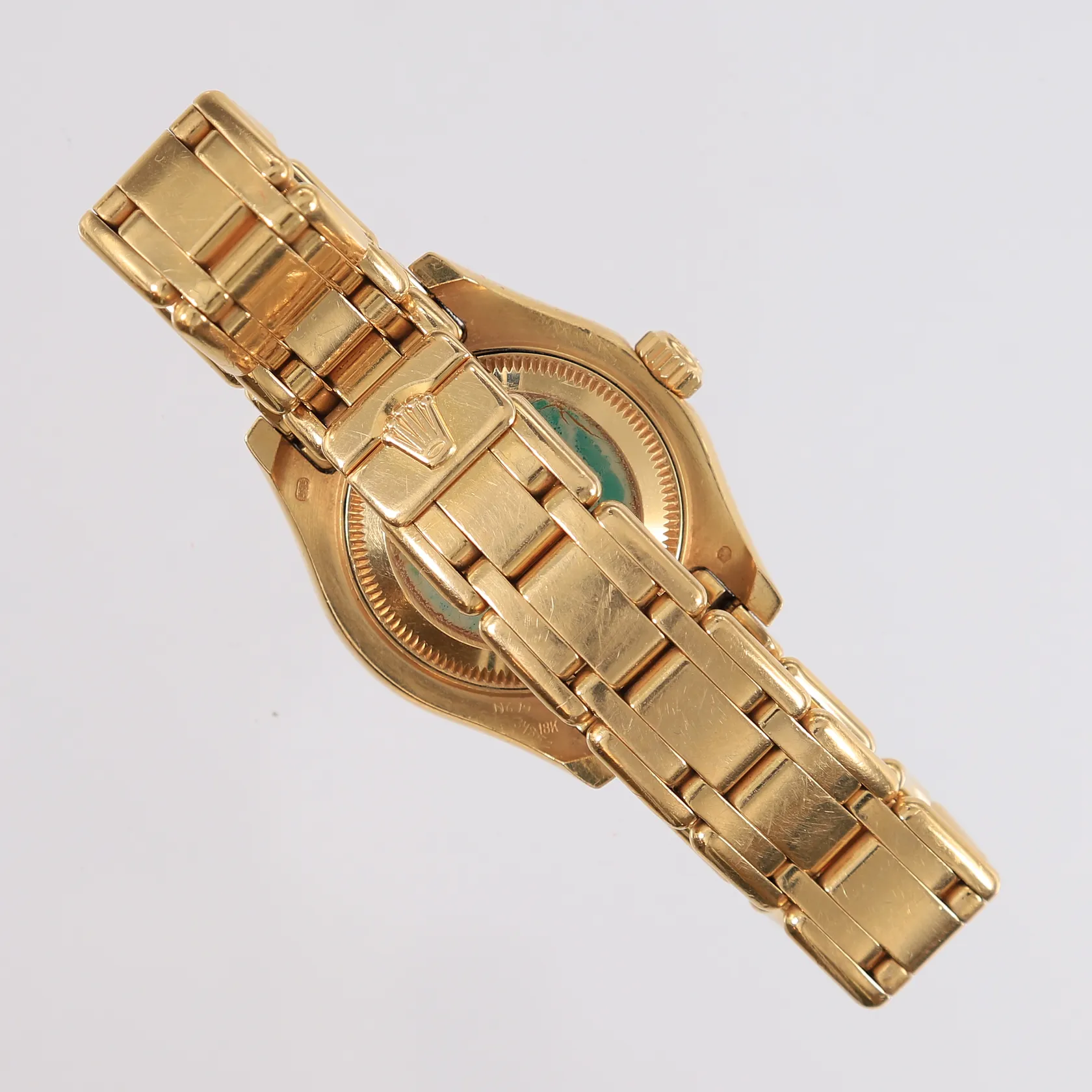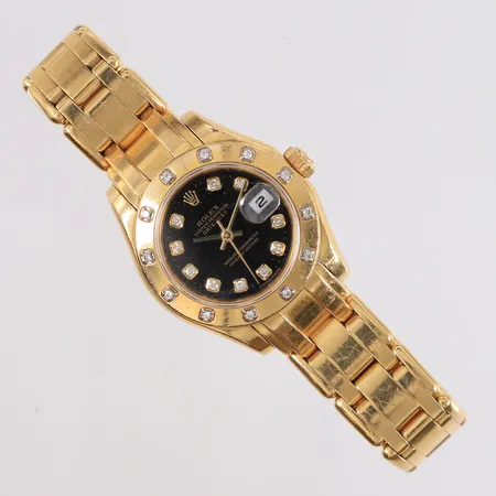 Armbåndsur Rolex Pearlmaster 18K, ref 80318, snr A626409, boettnr 2078, cal 2235, verknr O 132641, lenke i 18K gull, automat, dato, urskive med diamanter, sertifikat Bjerke år 1999, trenger service, sliten eske. Kontakt Lånekontoret for frakt