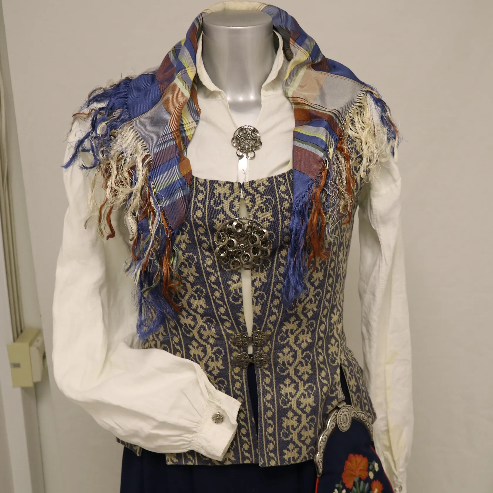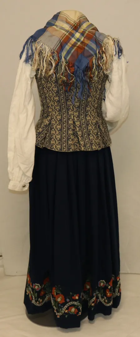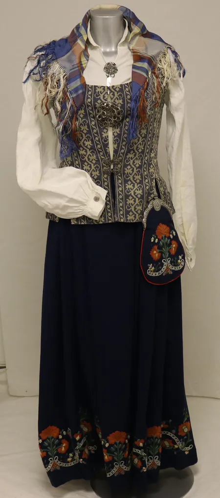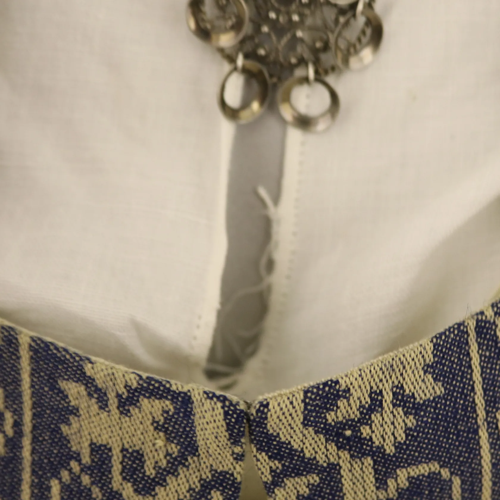 Trønderbunad str. M med skjorte, må renses, underskjørt, sjal, veske, 1 par mansjettknapper, 1 stor sølje, 1 liten sølje, 1 par dobber, hel lengde 140cm, skjørtelengde 99 cm, livvidde 79cm