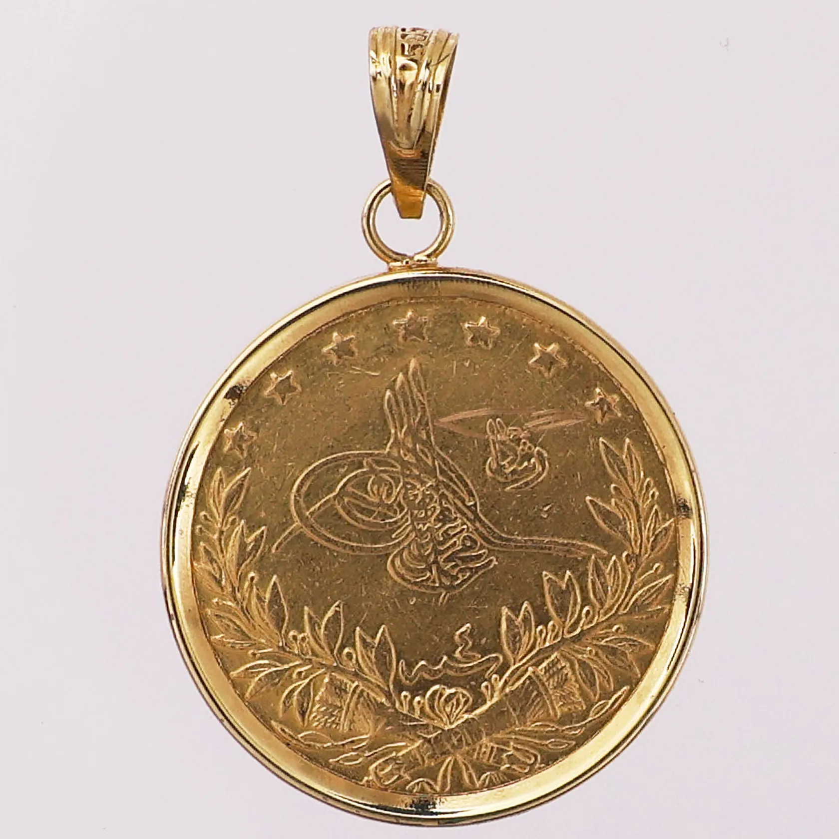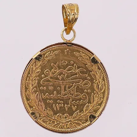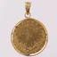 Medaljong, Ø 22,6 mm, bredde 1,7 mm, bezel, 14K, mynt, 22K Vekt: 7,8 g Kontakt Lånekontoret for frakt