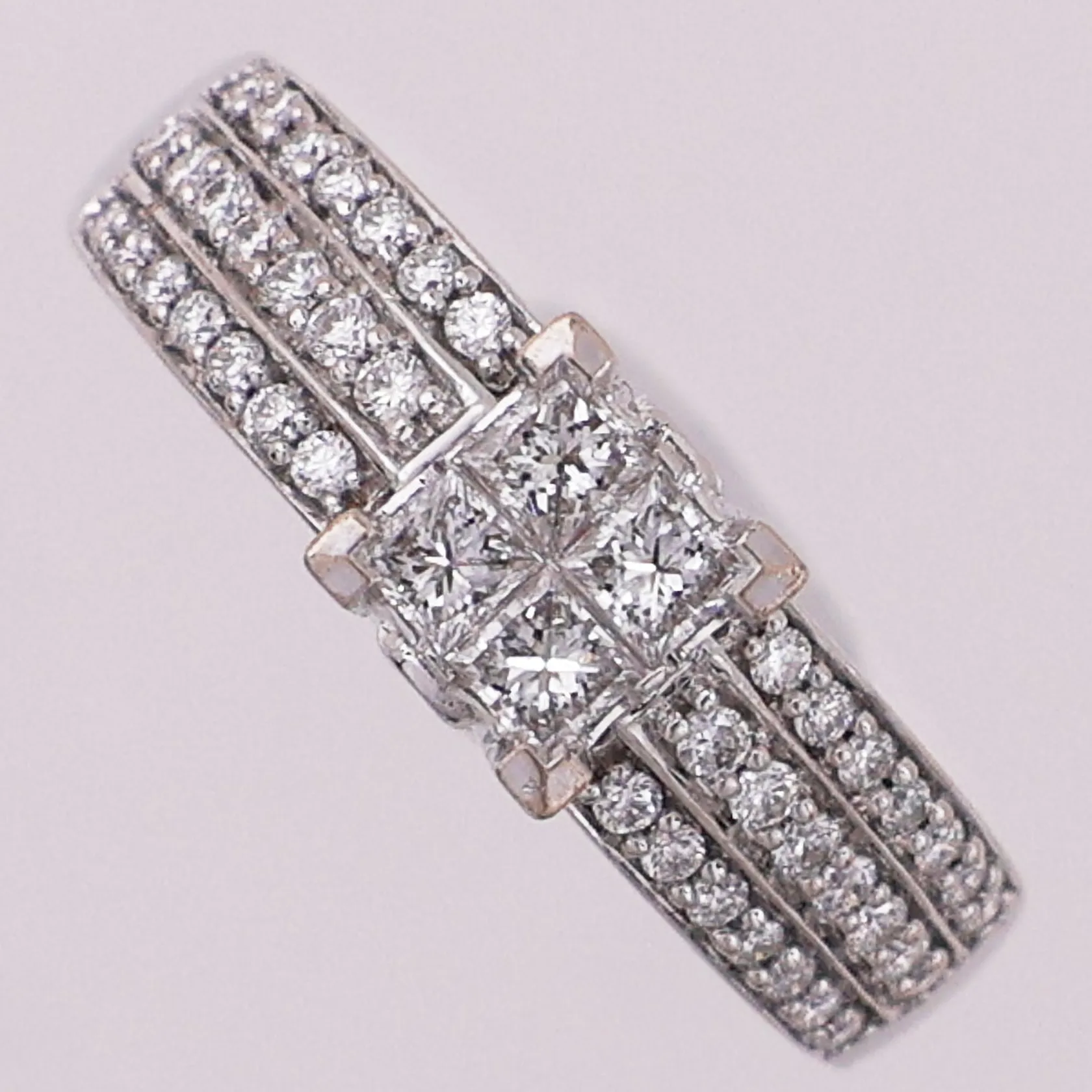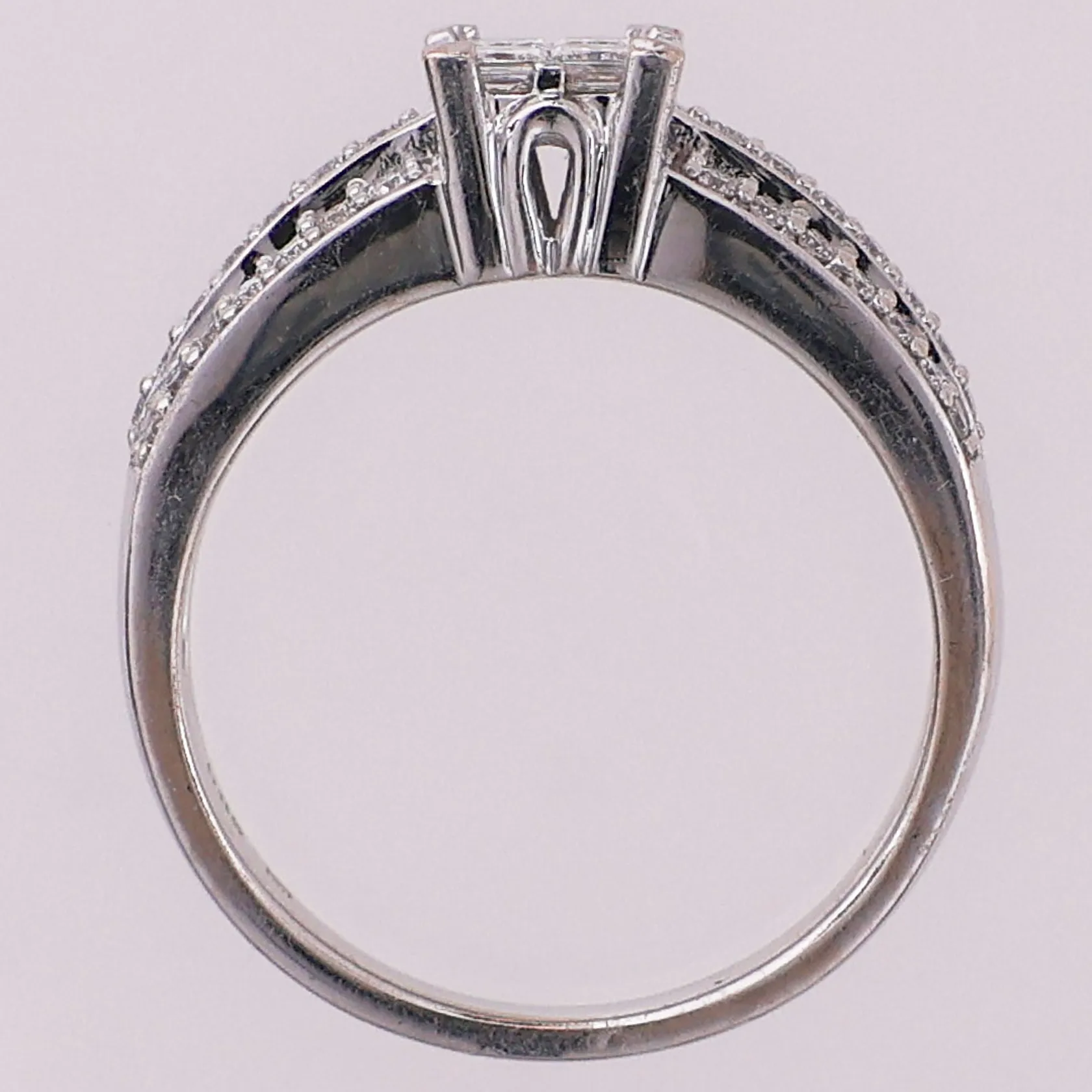 Ring med diamanter, 4 x ca 0,05 ct, 42 x ca 0,01 ct, Ø 17,1 mm, bredde 2,1 - 6,2 mm, 14K Vekt: 4,2 g Kontakt Lånekontoret for frakt
