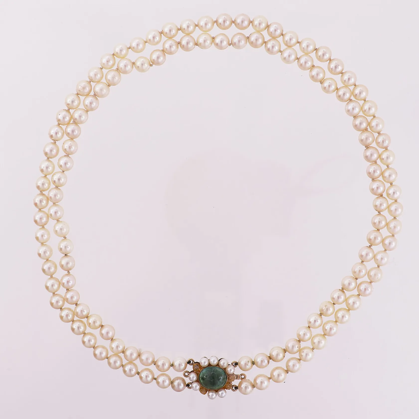 Perlekjede med lås i gull og grønn sten, lengde 47cm, bredde 1,5cm, mangler 4 perler, 14K Vekt: 58,9 g Kontakt Lånekontoret for frakt