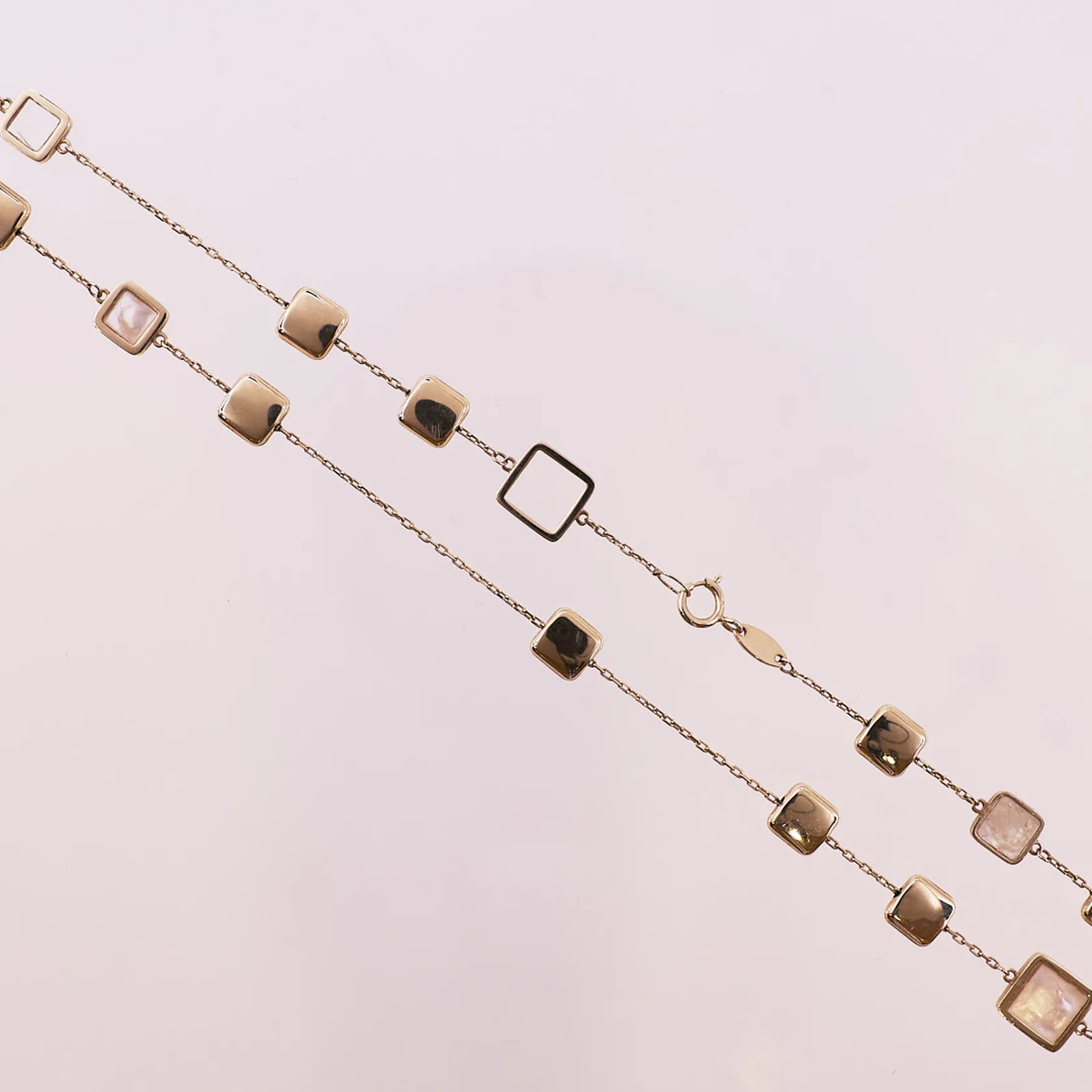Halskjede med perlemorsplater, lengde 46, bredde 6mm, 2 perlemorsplater mangler, 14K Vekt: 5,2 g Kontakt Lånekontoret for frakt