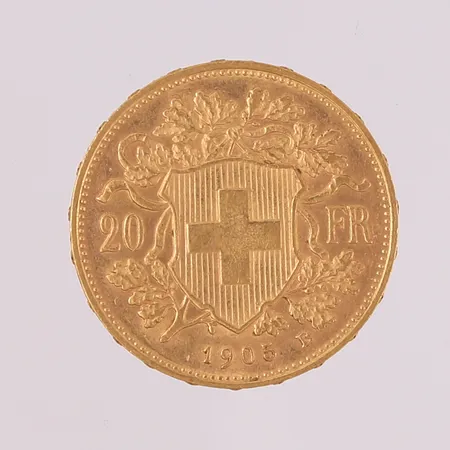 Gullmynt, 20 Franc Helvetia år 1905, 21,6K Vekt: 6,4 g Kontakt Lånekontoret for frakt