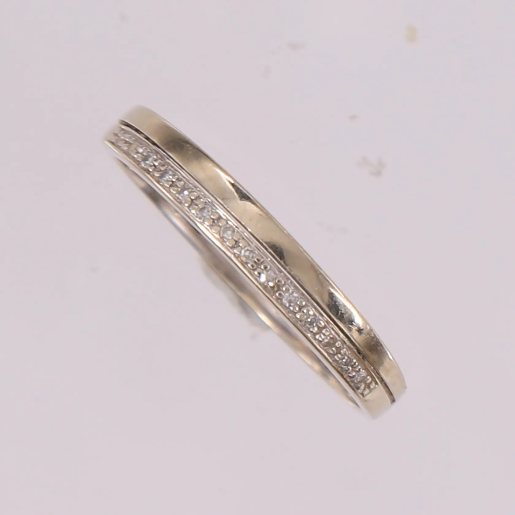Ring med briljantslipte diamanter (14 x ca. 0,005ct), ø17,7mm, bredde 1,4- 3mm, hvitt gull, 14K Vekt: 1,4 g Kontakt Lånekontoret for frakt
