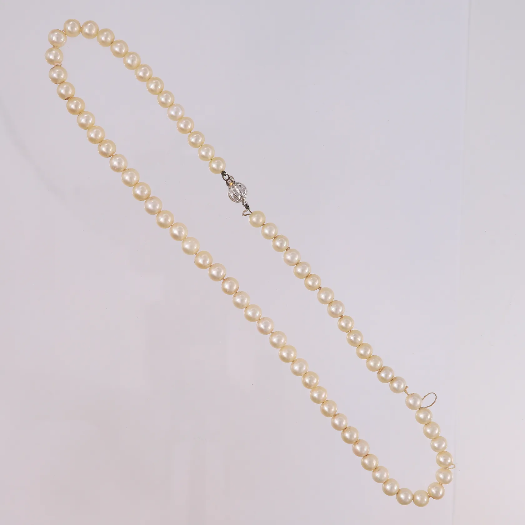 Perlekjede (saltvannsperler) med lås i hvitt gull, lengde 42,5cm, bredde 6cm, 14K, bruttovekt 21,5g Kontakt Lånekontoret for frakt