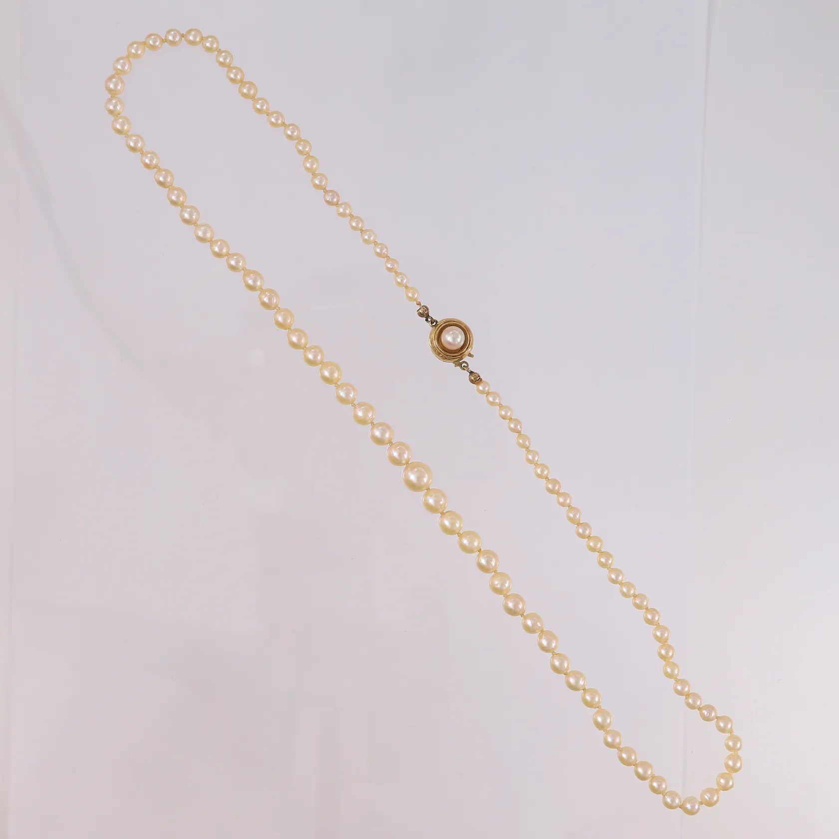 Perlekjede (saltvannsperler) med gull-lås, dosert, lengde 49,5cm, bredde 3- 7,4cm, 14K, bruttovekt 14,6g Kontakt Lånekontoret for frakt