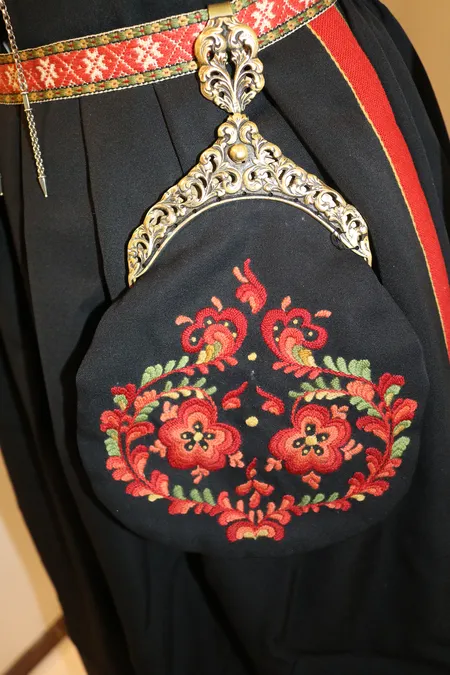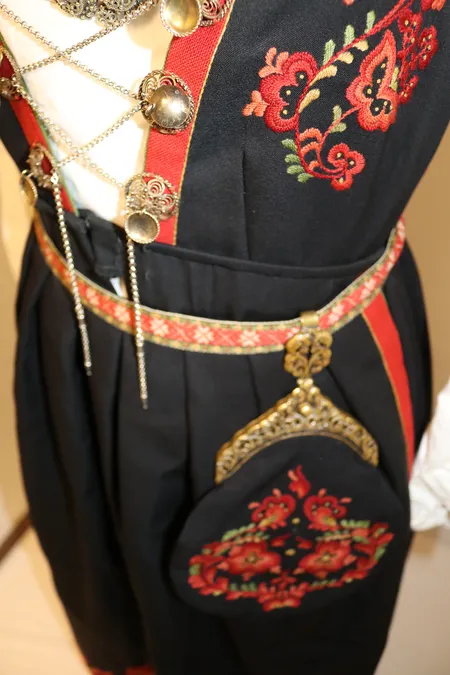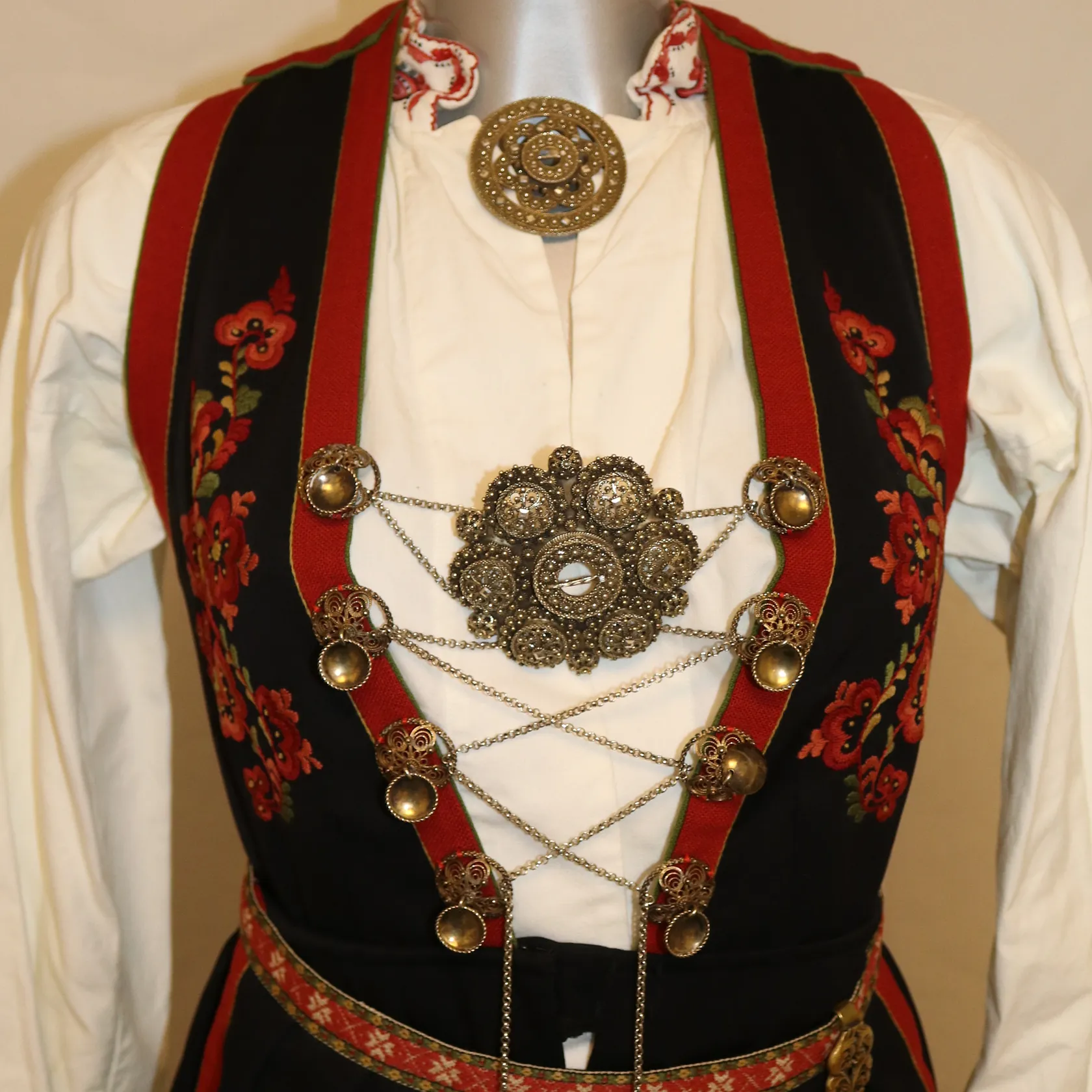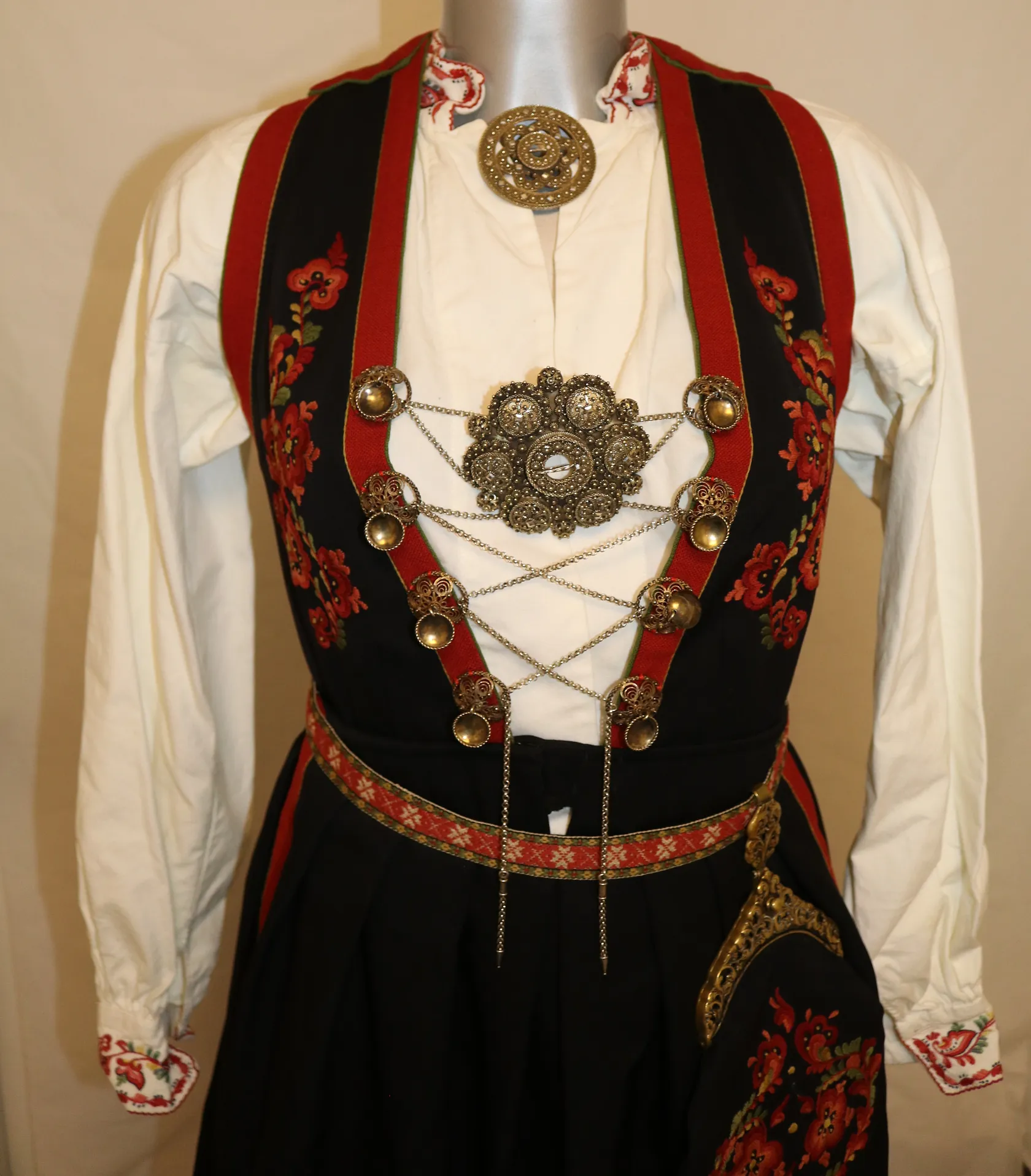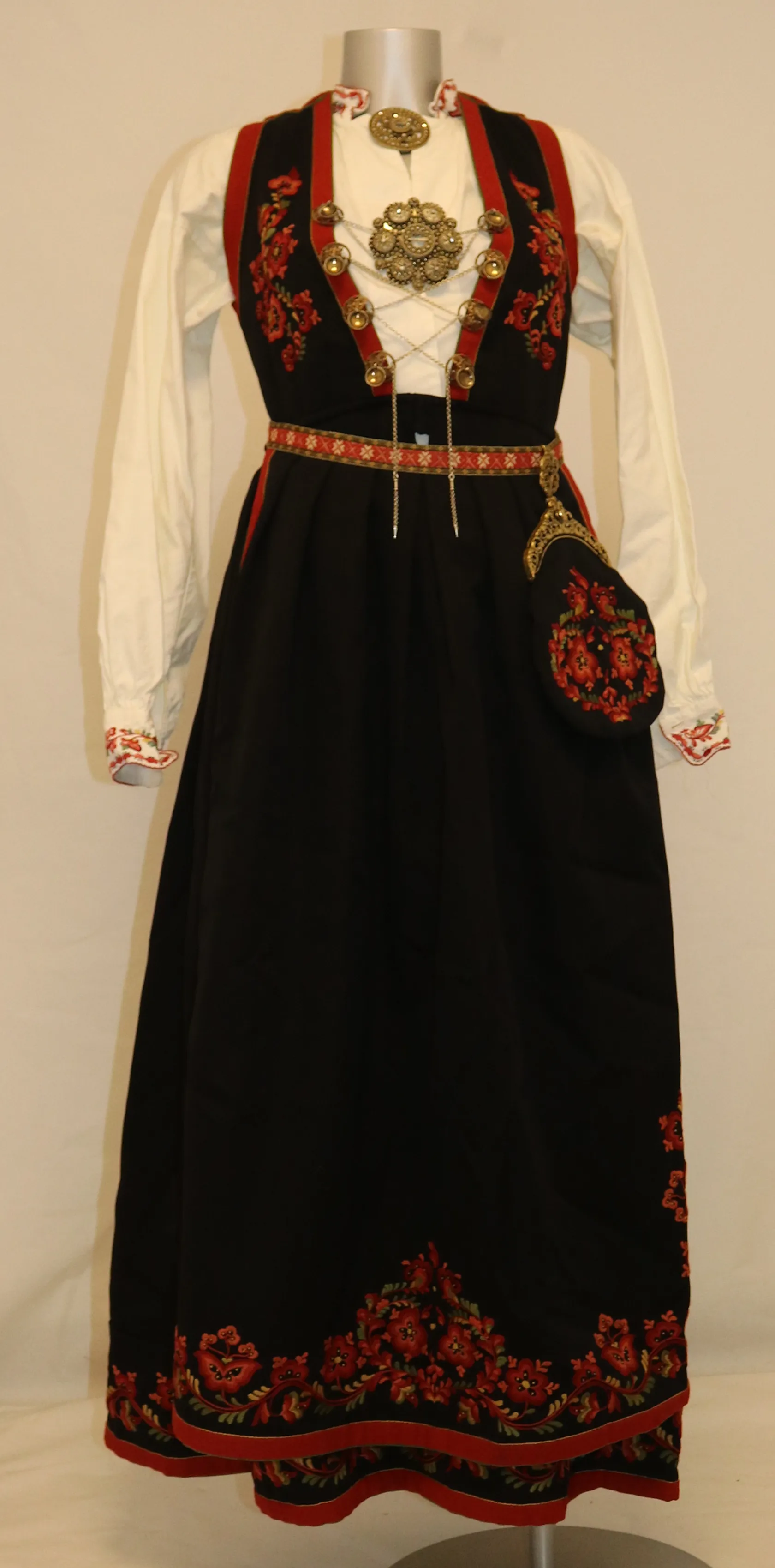 Vest-Telemark bunad (dame, ca. str. 36/38) med skjorte, forkle, veske, sølvsnor, 1 stor sølje, 2 små søljer og ett par mansjettknapper. Brystvidde 90cm, livvidde 80cm, total lengde 130cm Kontakt Lånekontoret for frakt