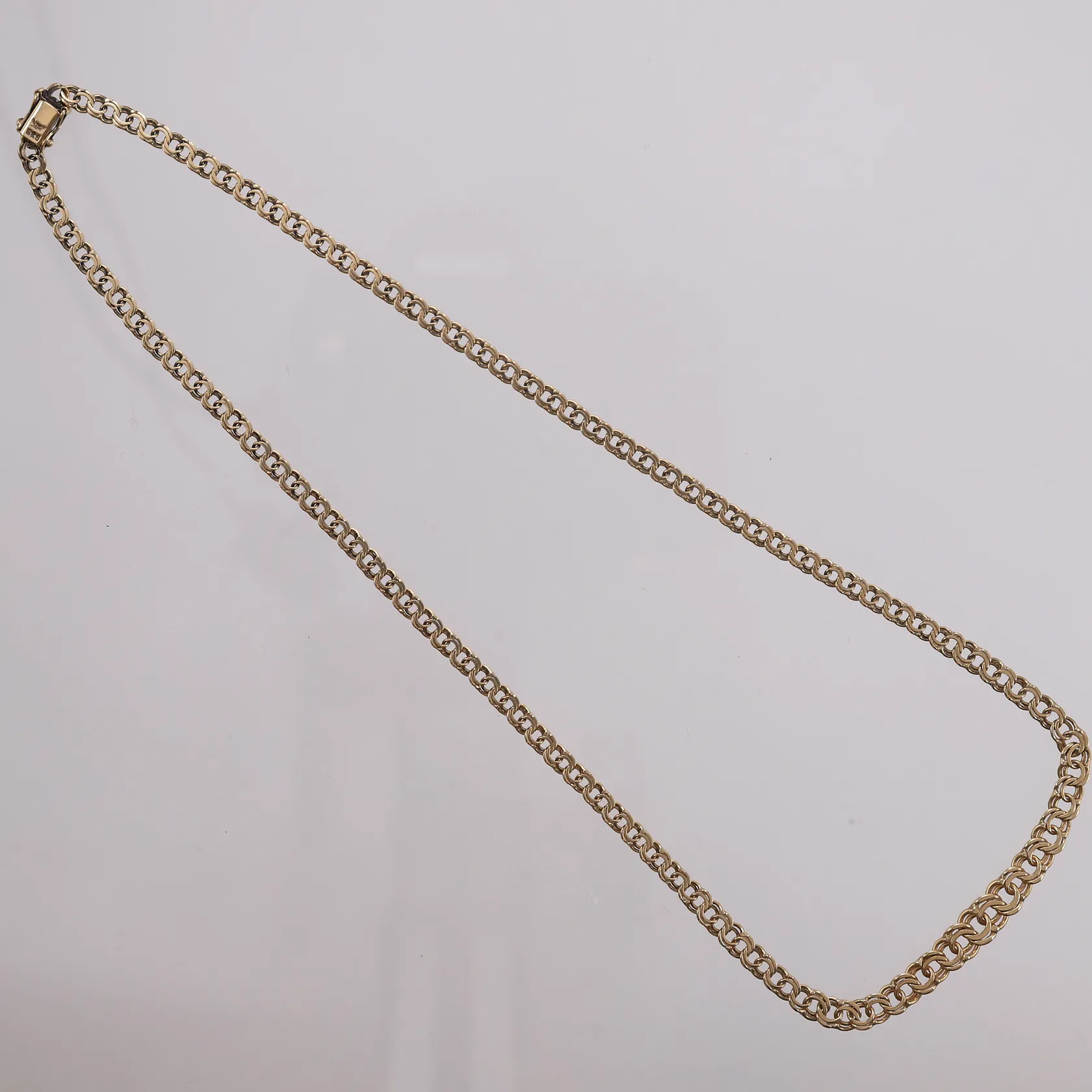 Kjede Bismarck, dosert, lengde 43cm, bredde 3- 6mm, slitt/defekt lås (sikkerhetslås fungerer), 14K Vekt: 9,9 g Kontakt Lånekontoret for frakt