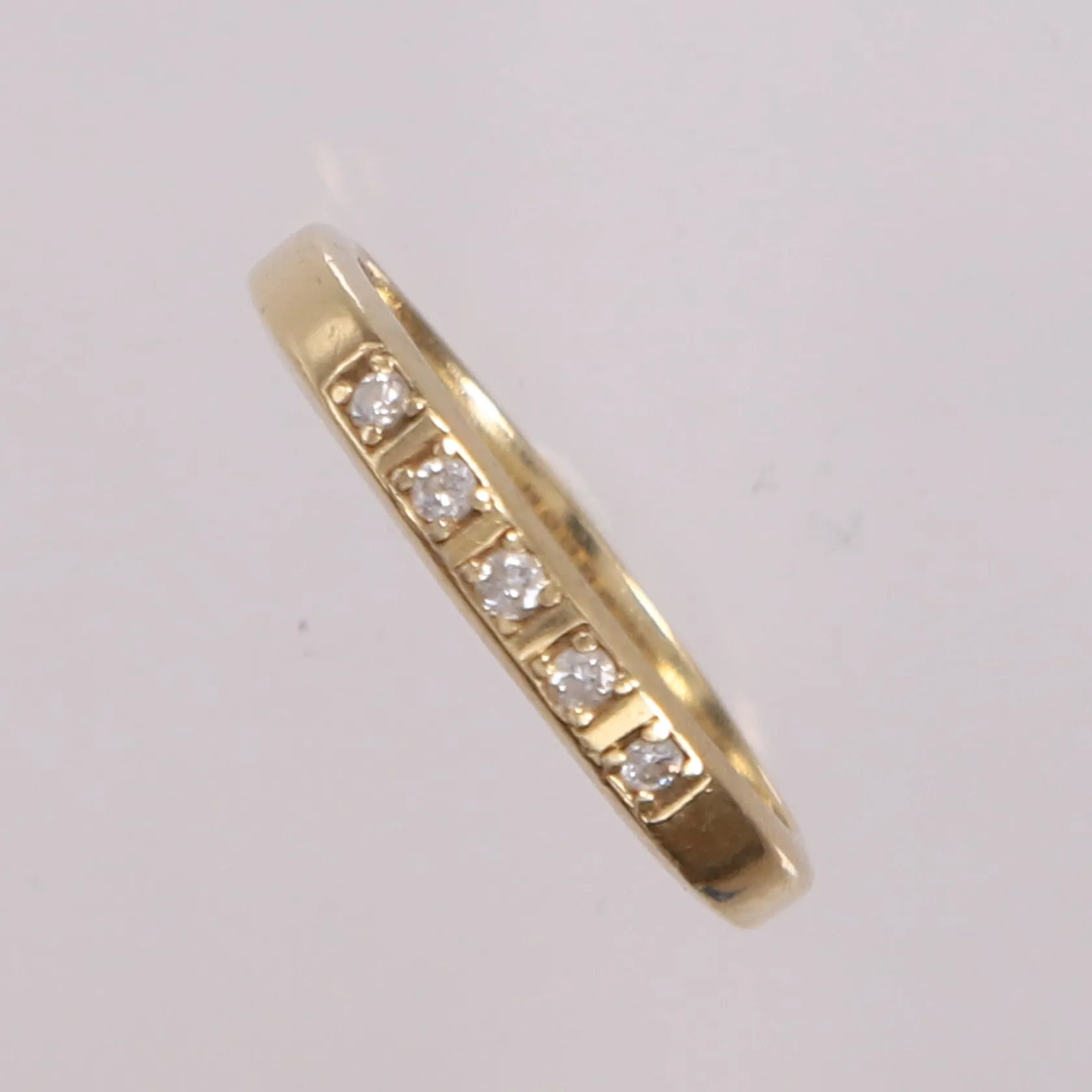 Ring med 5 diamanter (totalt 0,10ct iht. gravering), ø18,2mm, bredde 2,7- 3mm, 14K Vekt: 2,6 g Kontakt Lånekontoret for frakt