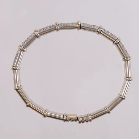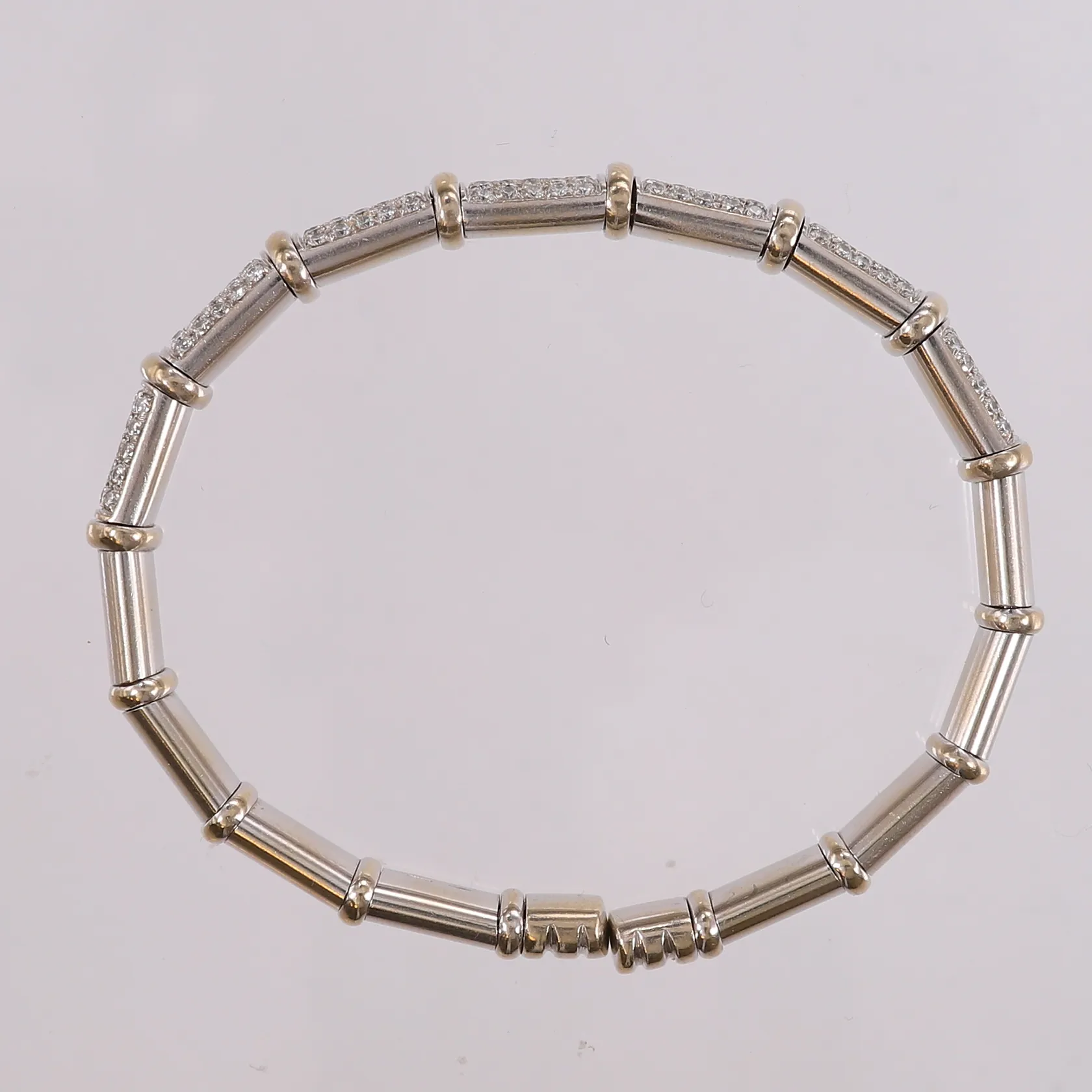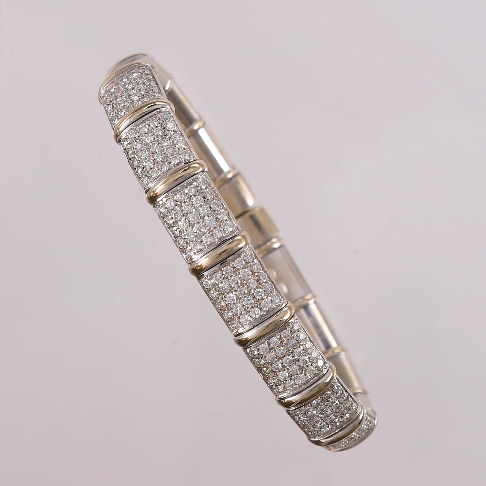 Armbånd med briljantslipte diamanter (175 x ca. 0,015ct), oval, kan åpnes, 58x47mm, bredde 8,2- 9mm, 18K Vekt: 41,7 g Kontakt Lånekontoret for frakt
