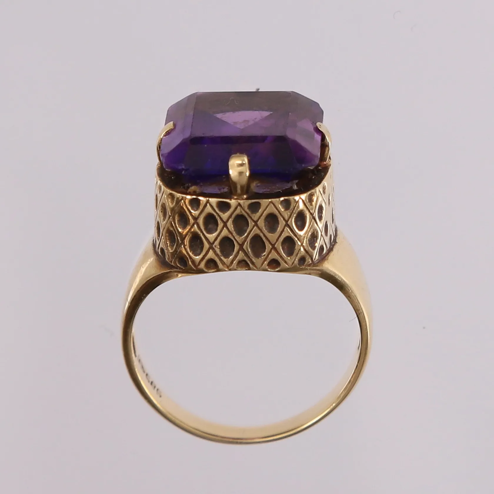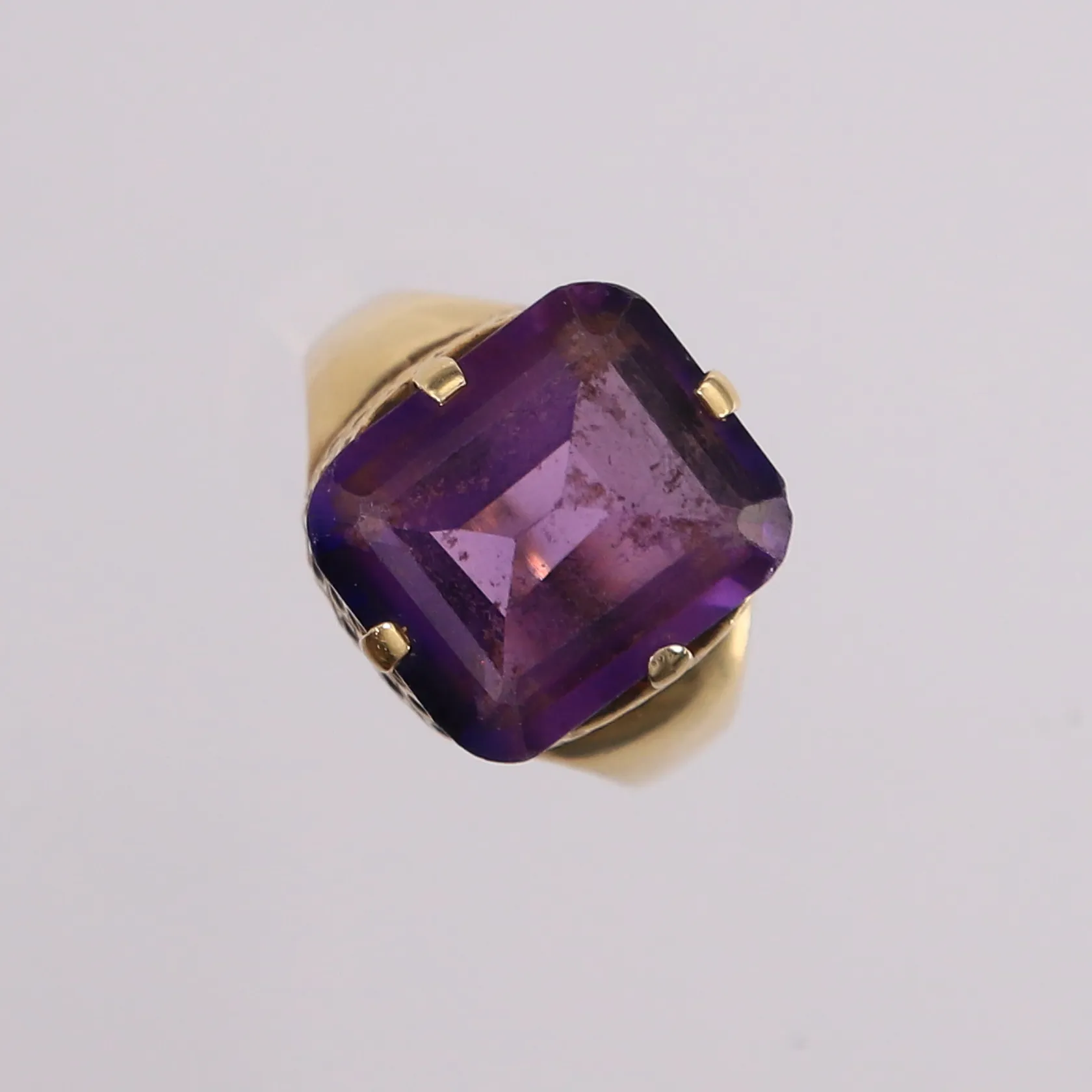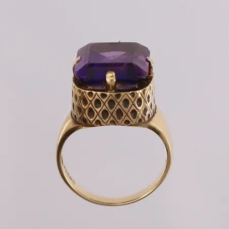 Ring med lilla sten, ø16,5mm, bredde 2,5-15mm, 14K Vekt: 6,5 g Kontakt Lånekontoret for frakt